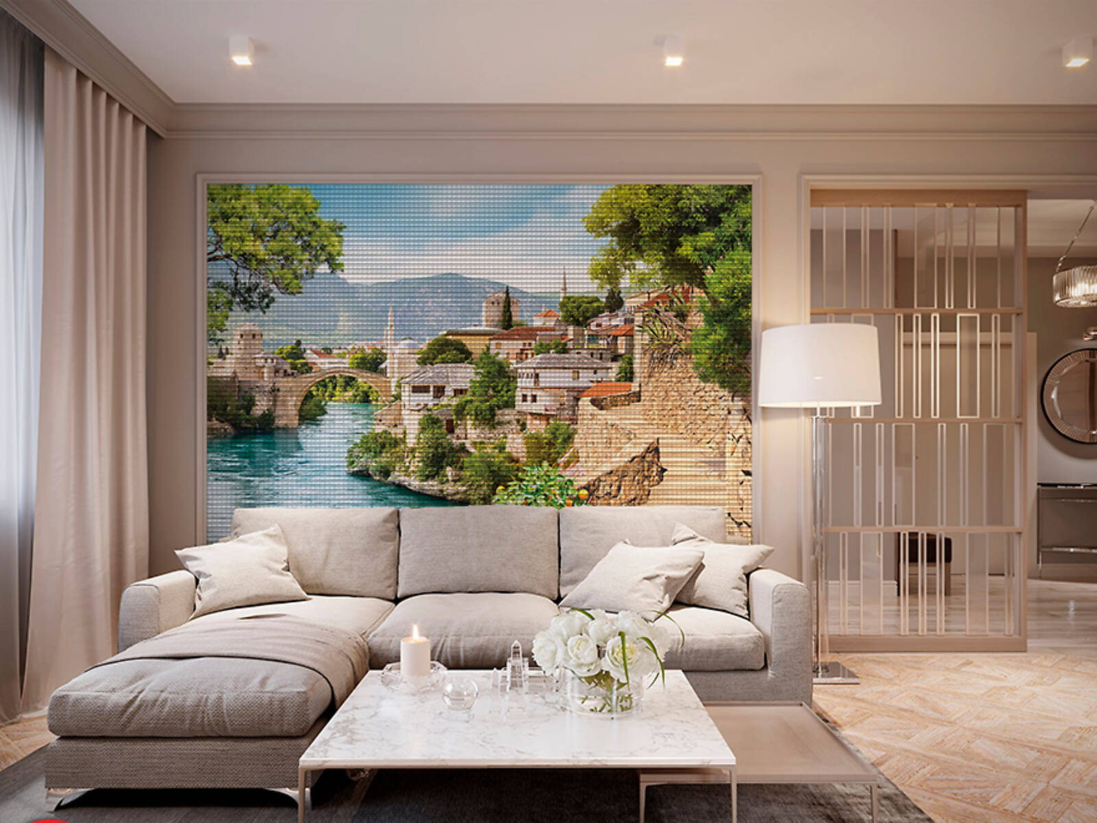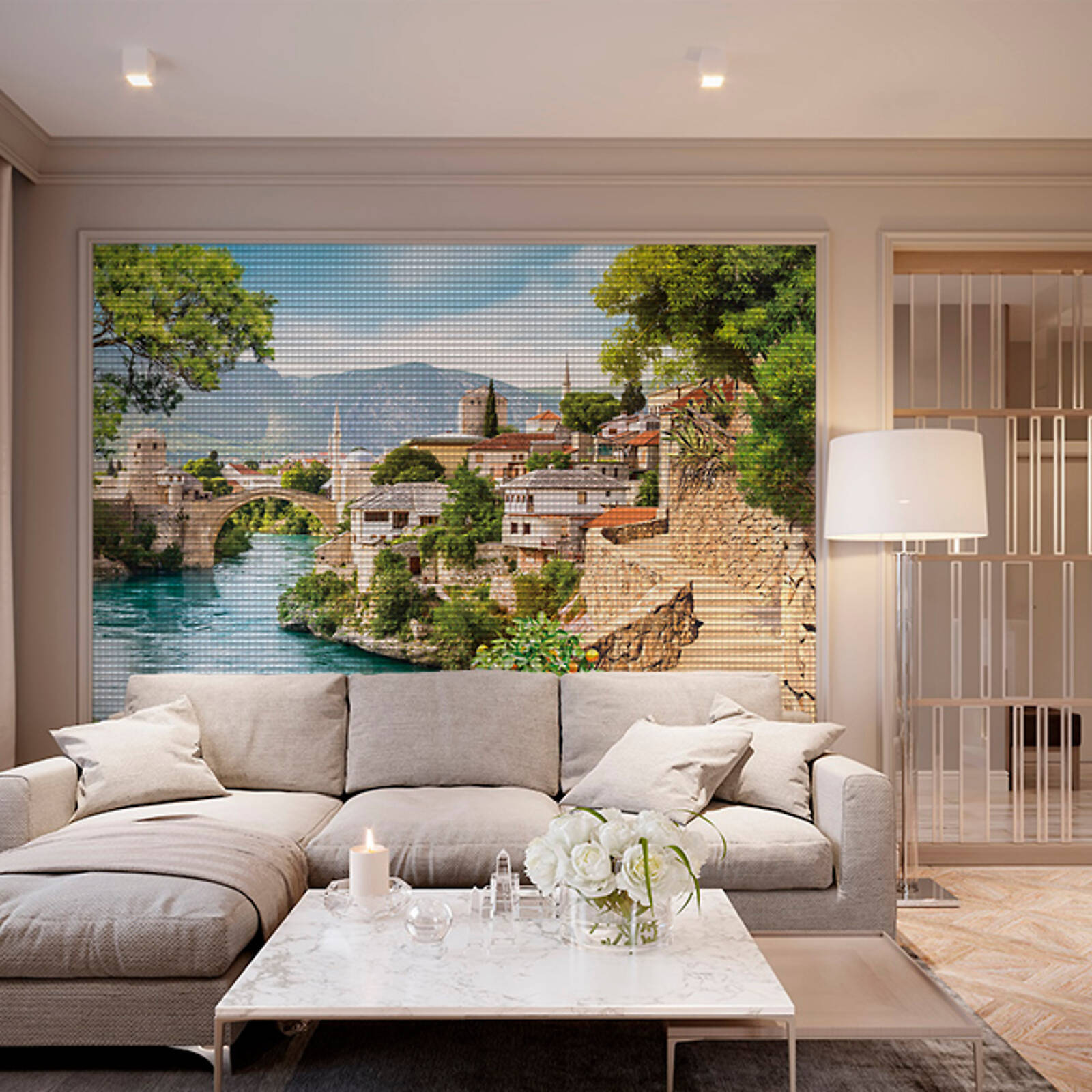 Сетка из стекловолокна, создающая несущую основу плитки-матрицы, гибкая. Это позволяет покрывать мозаикой Fabrizio Roberto® разноуровневые и криволинейные поверхности (бортики бассейнов, своды, колонны).