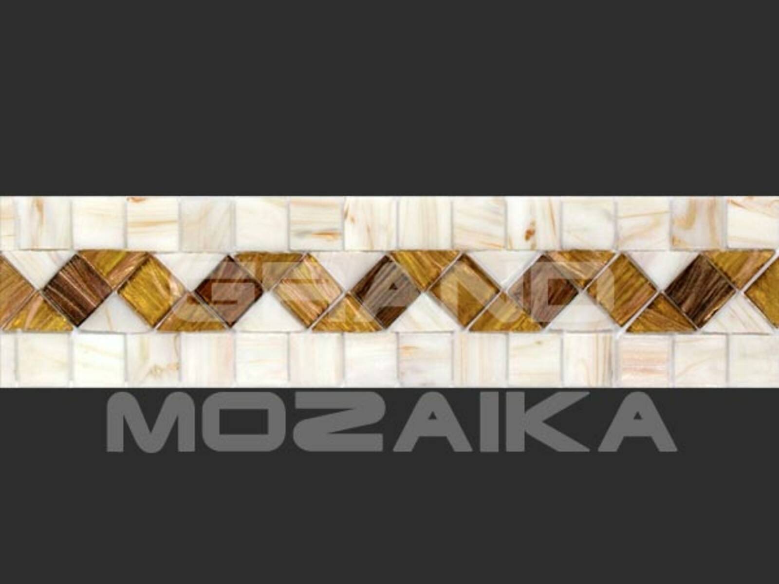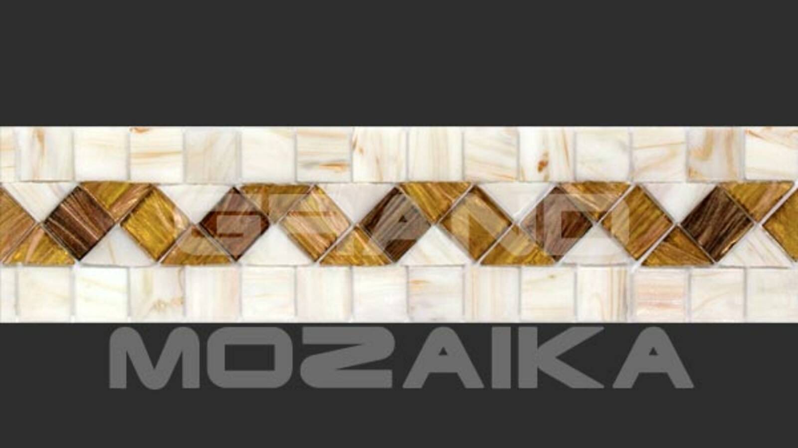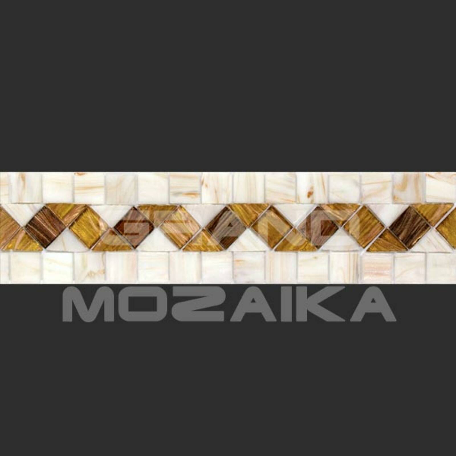 Матричный бордюр из коллекции для бассейнов Alma выполнен из небольших глянцевых кусочков. Бордюр украшен необычным геометрическим рисунком бежевого и желтого цвета.Такой бордюр будет прекрасно смотреться в сочетании со стеклянными мозаиками из других серий.