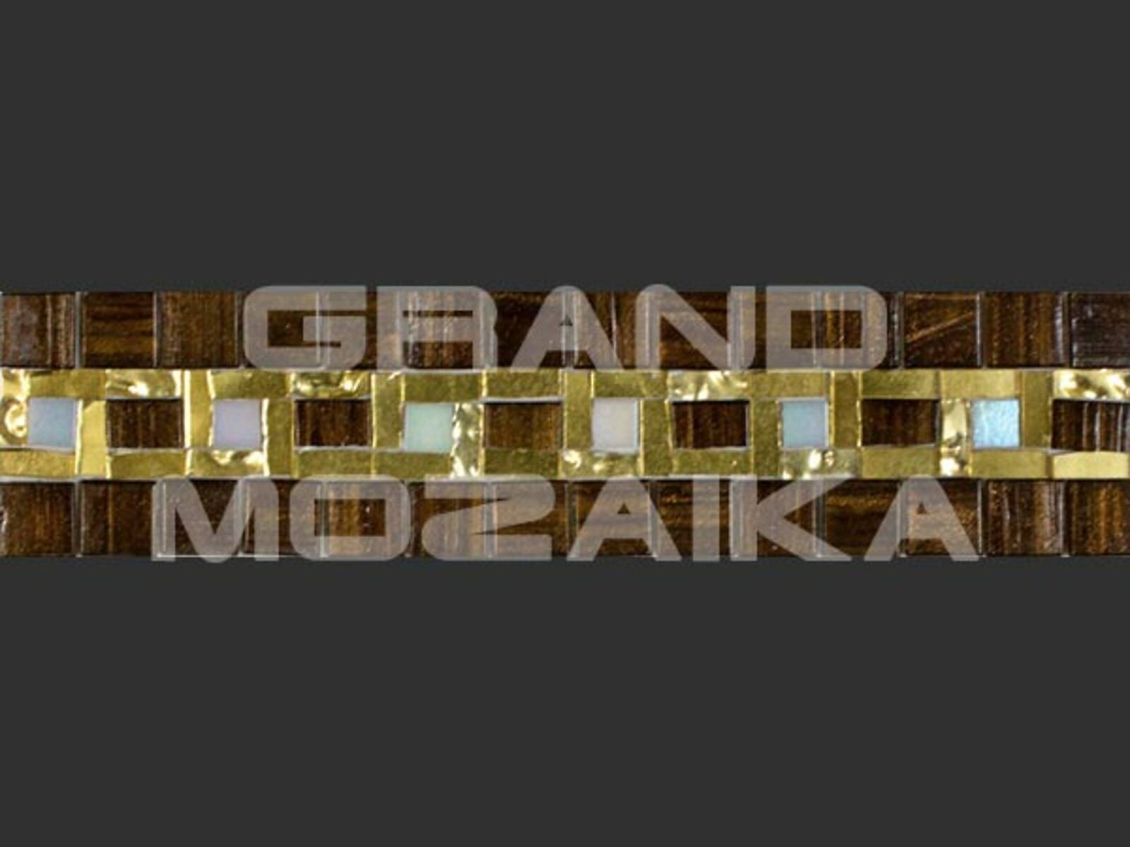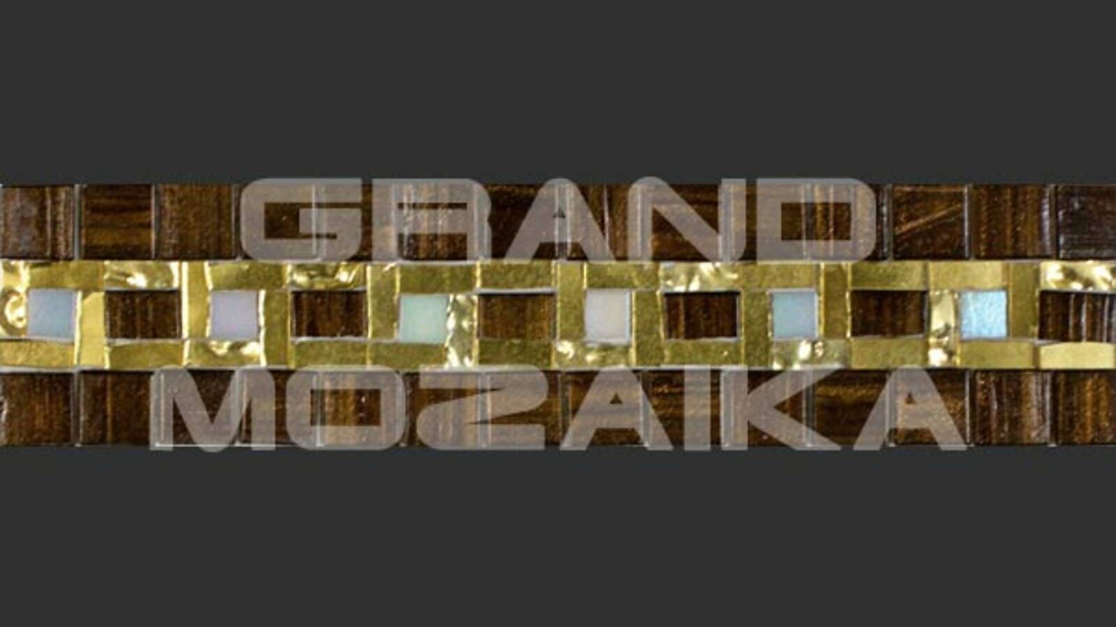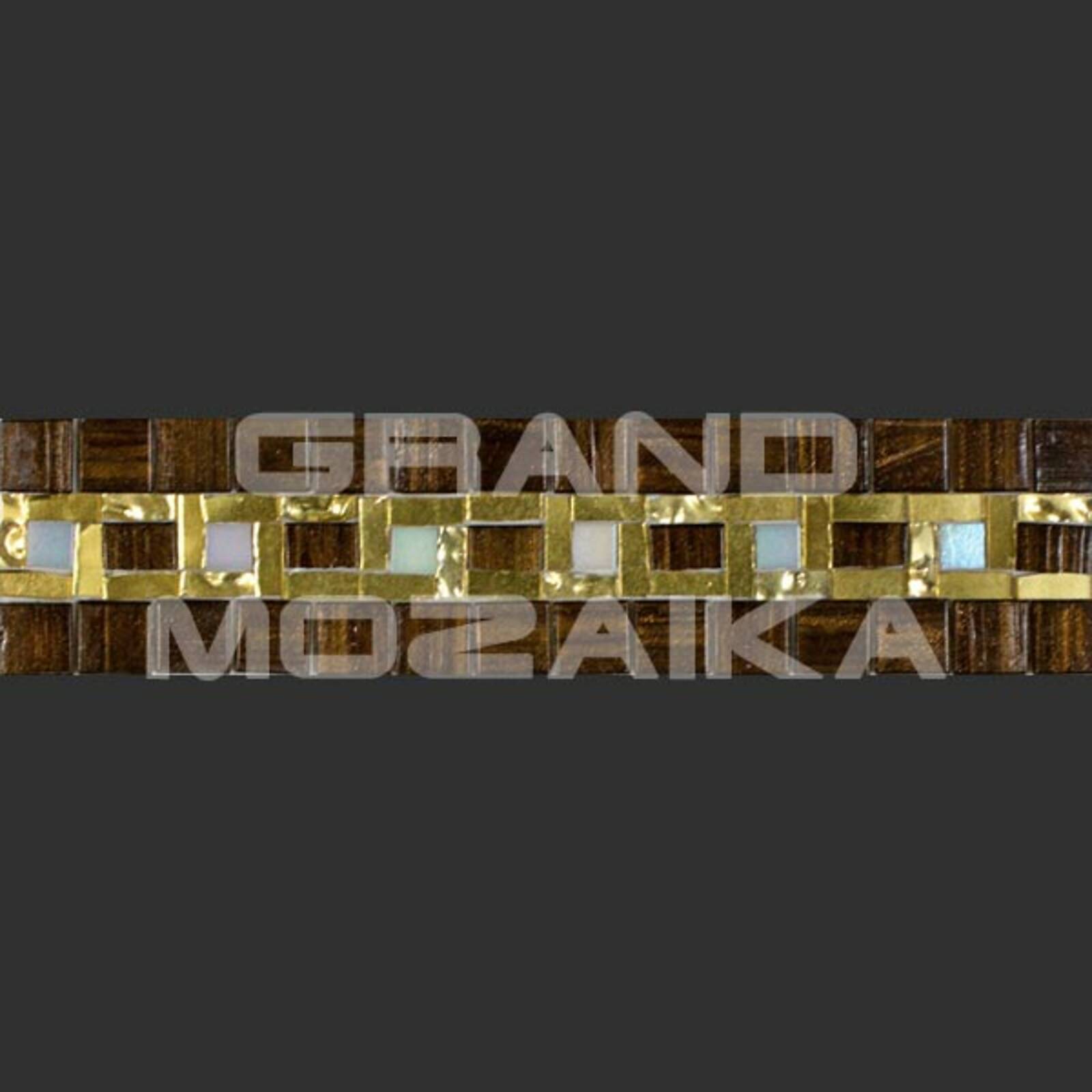 Матричный бордюр из коллекции для бассейнов Alma выполнен из небольших глянцевых кусочков. Бордюр украшен необычным геометрическим рисунком коричневого и белого цвета. Вкрапление золотых мозаик придают рисунку роскоши. Такой бордюр будет прекрасно смотреться в дизайне бассейна в сочетаниями со стеклянными мозаиками из других серий.
