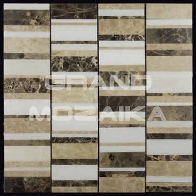 Мозаика из натурального камня серии S-Line выложена из коричневого, бежевого и белого полированного мрамора произвольной формы. Кусочки различной формы создают строгий геометрический рисунок. Такая мозаика украсит любой интерьер.
