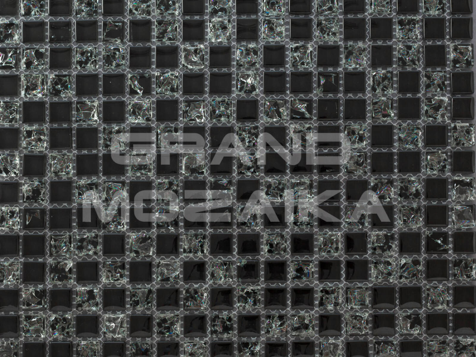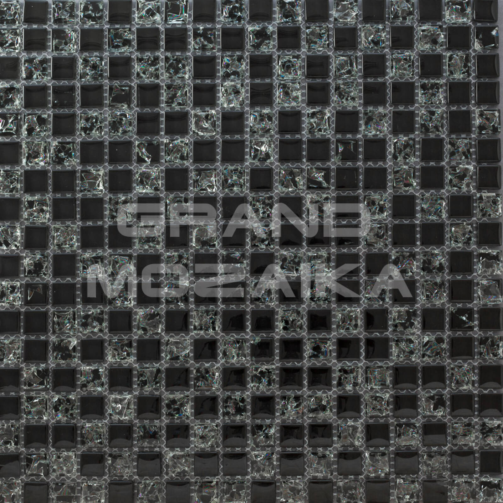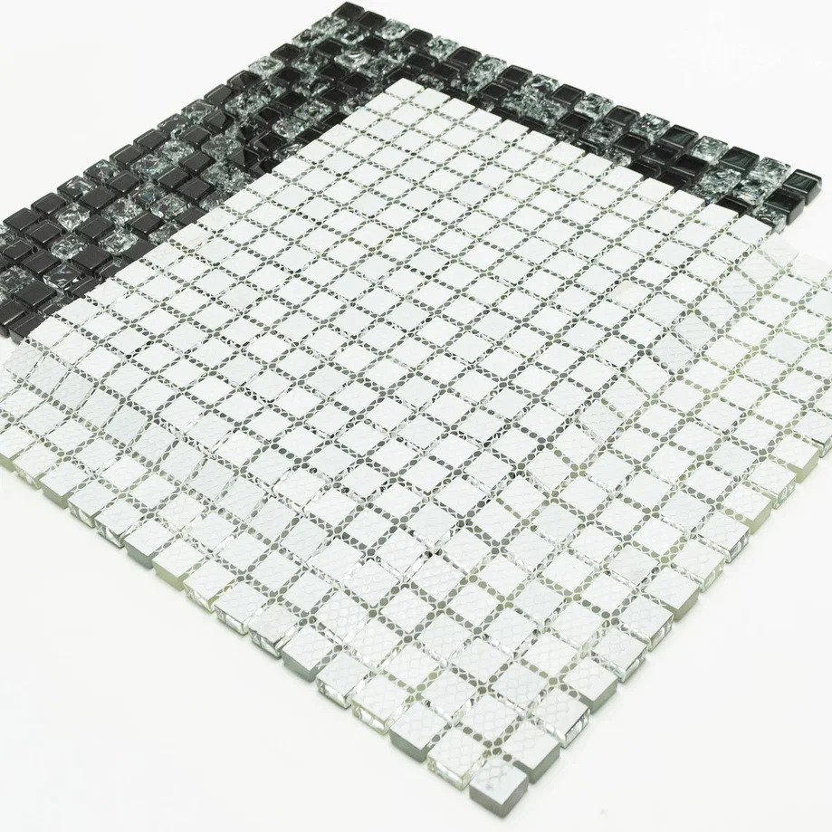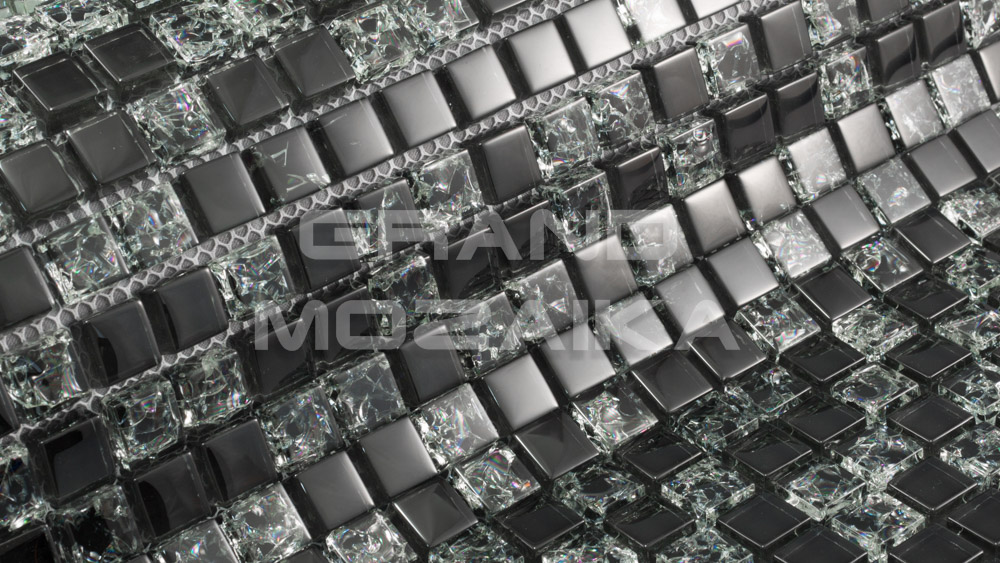 Стеклянная мозаика серии Exclusive состоит из стеклянных глянцевых плиток черного цвета и плиток с рисунком - серебристым узором по всей толщине чипа. Плитки размером 15х15 мм. Полотно размером 305х305 мм легко в монтаже. Толщина мозаики 8 мм, что придает мозаике особую прочность и надежность. Отлично подходит для настенной и напольной отделки ванных комнат, саун, а также облицовки бассейнов.