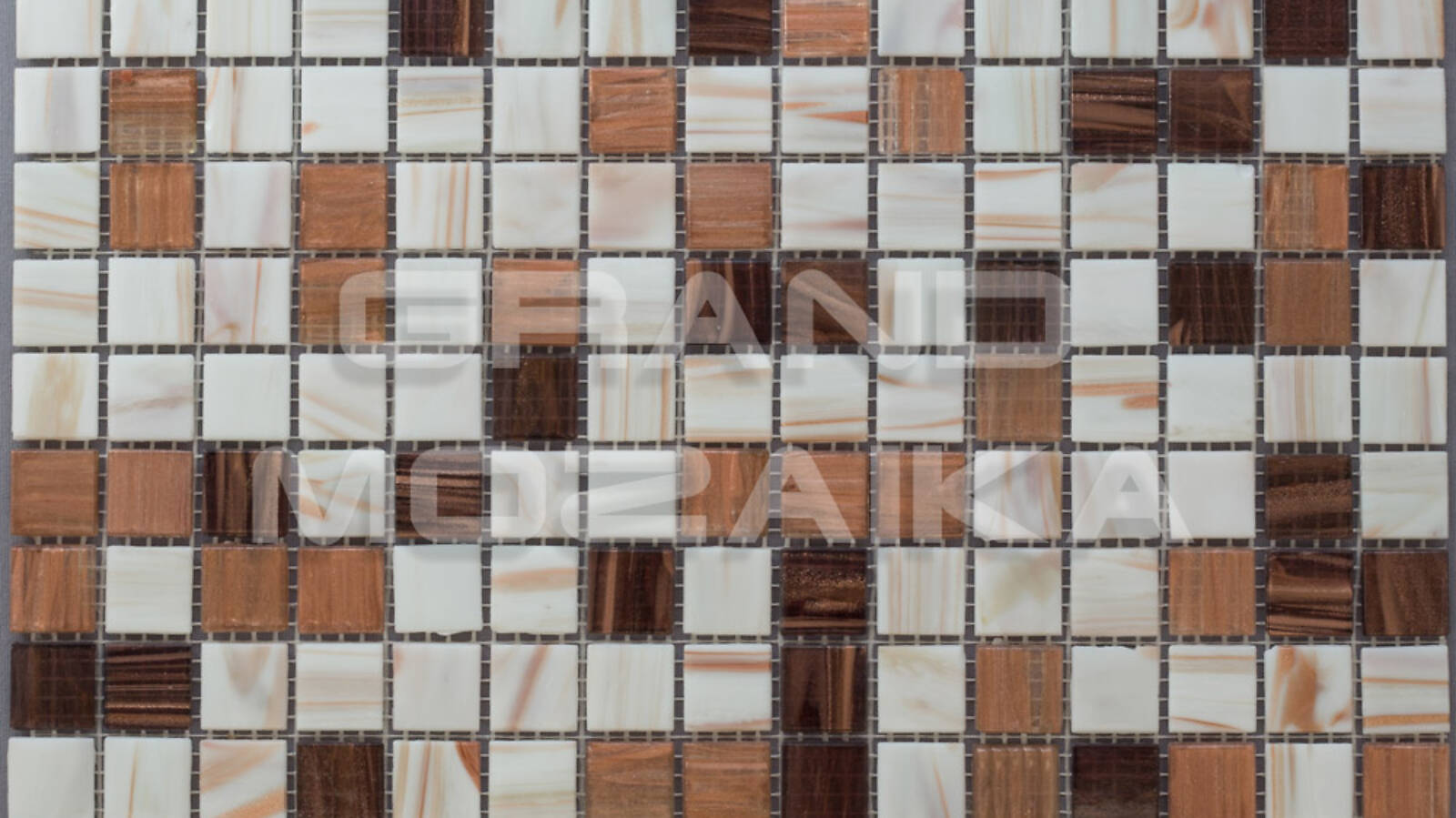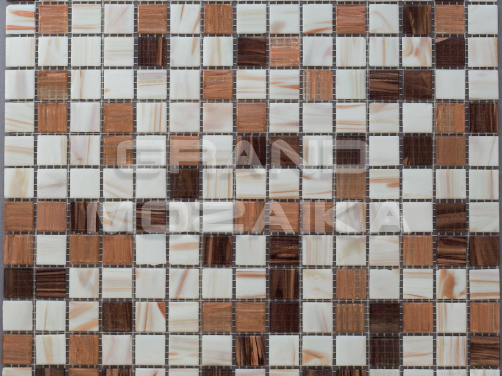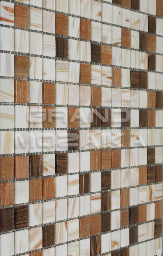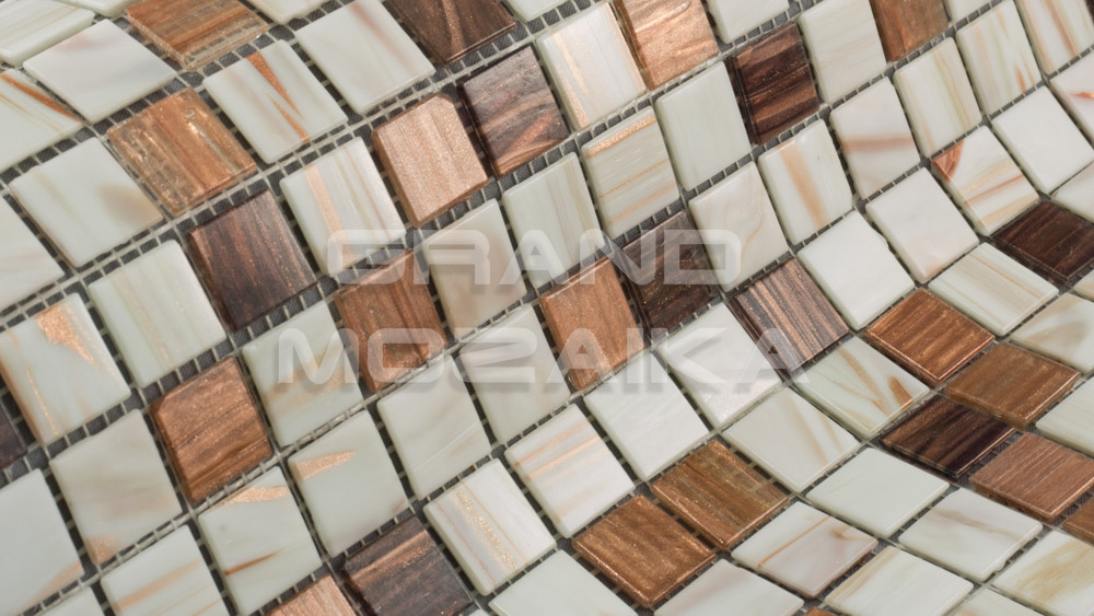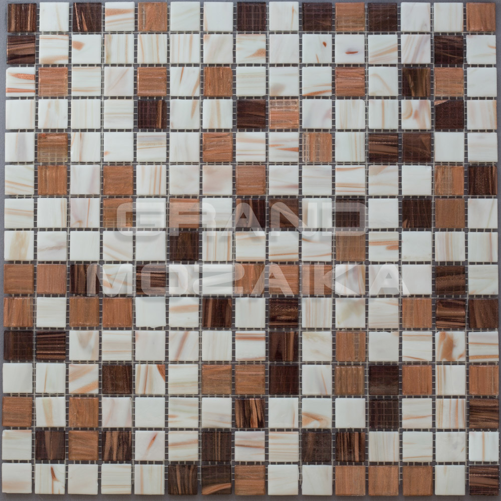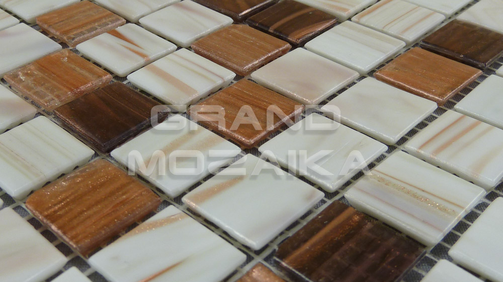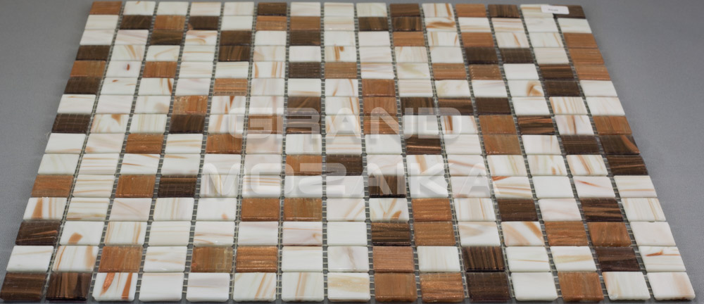 Мозаика стеклянная серии Golden состоит из смеси коричневых и белых плиток с золотыми примесями. Модули размером 20х20 мм. Полотно 327х327 мм крепится к сетке, легко в монтаже. Толщина 4 мм. Рекомендуется как для напольного так и для настенного декора. Мозаика микс станет утонченным убранством для любого дизайнерского решения.