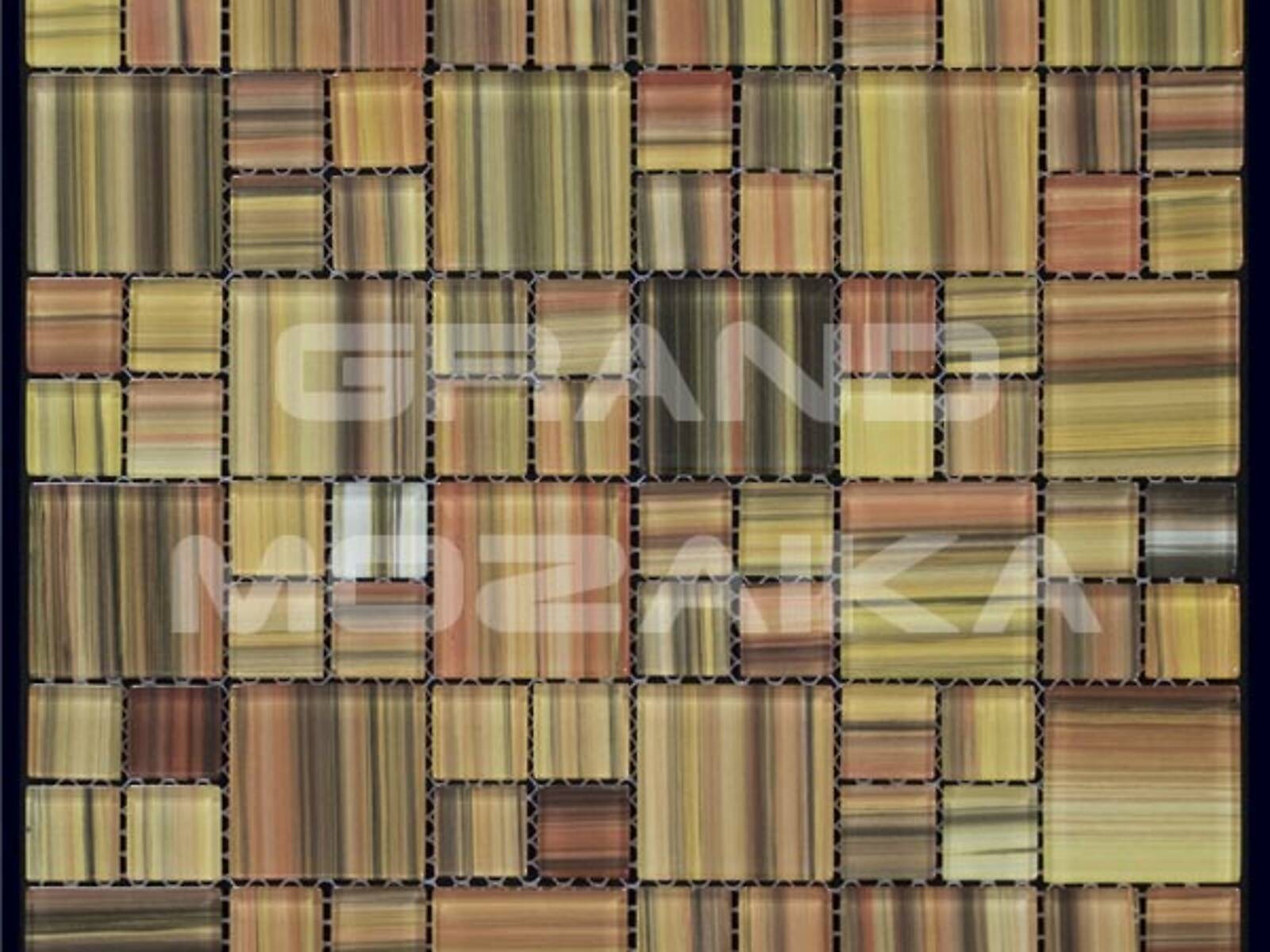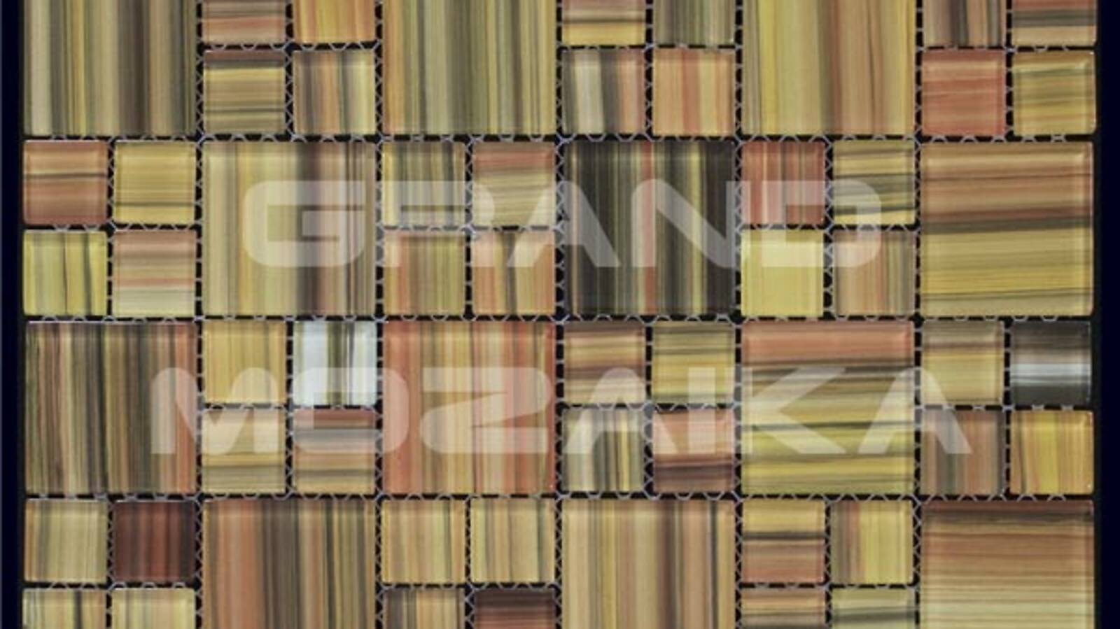 Стеклянная мозаика серии Ethnic состоит из кусочков различных размеров 23,5х23,5 и 48,5х48,5. Необычная расцветка всех оттенков коричневого радужно перекликающихся друг с другом придает еще больше оригинальности. Полотно размером 300х300 удобно в укладке и не требует особых навыков.