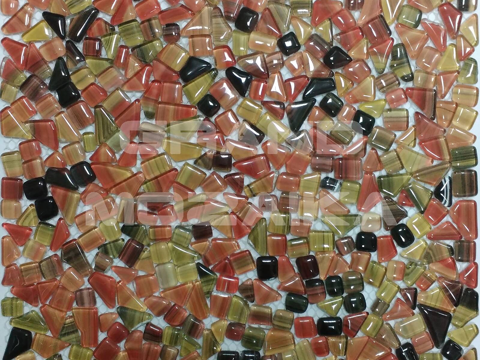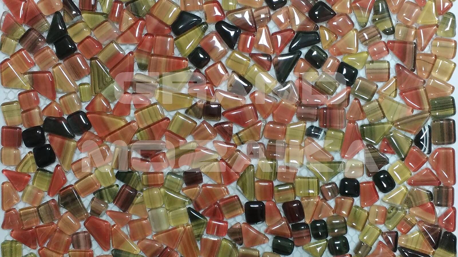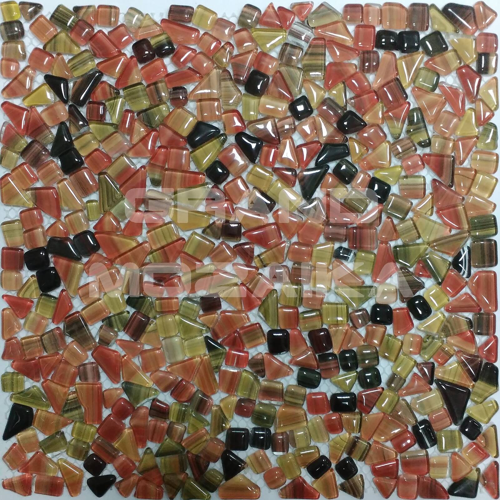 Стеклянная мозаика серии Gem отличается необычностью формы элементов. Каждый кусочек не похож на соседний не только по форме, но и по окраске. Сочетание светло-коричневых обточенных элементов создает впечатление хаотически разбросанных камушков естественного происхождение. Такая мозаика станет украшением любого интерьера.