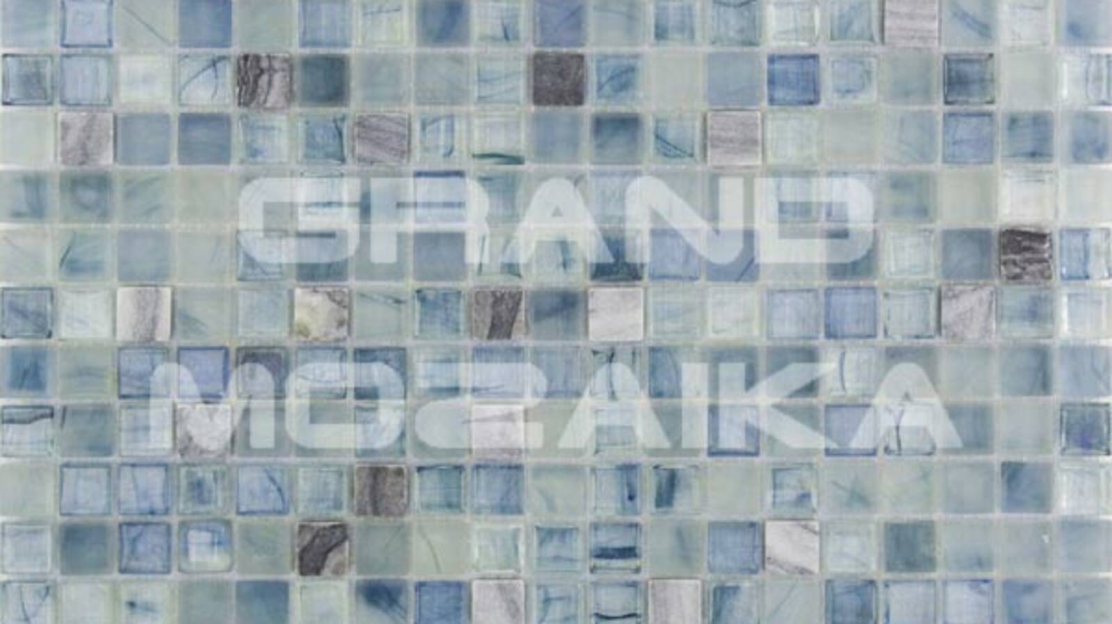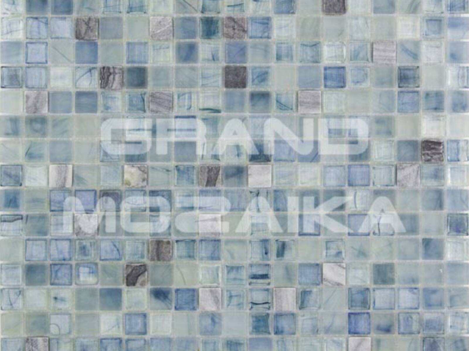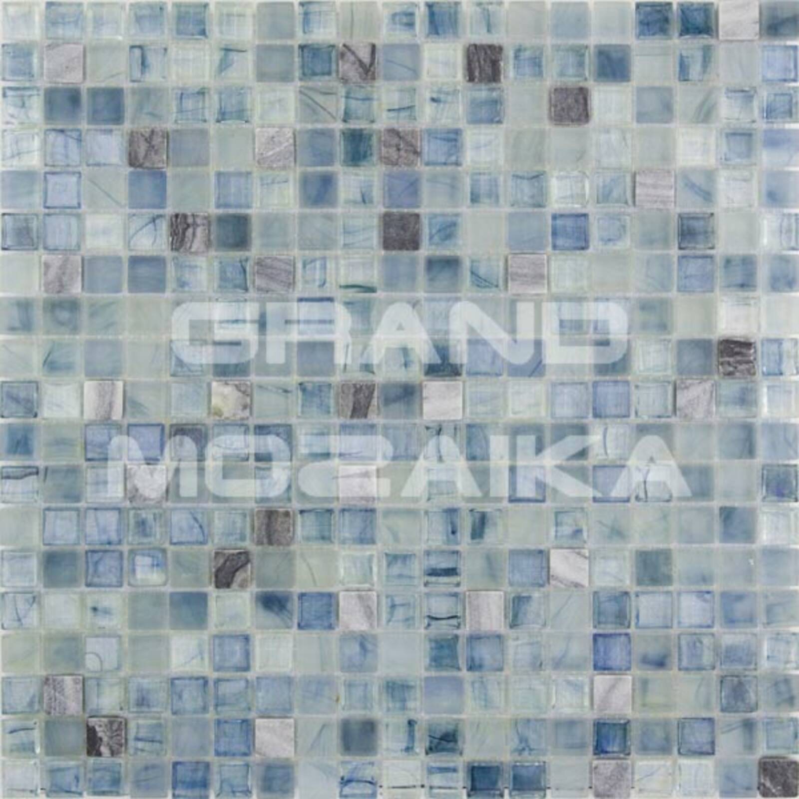 Мозаика серии Amber выполнена из маленьких кусочков размером 15х15 мм. Элементы голубого цвета сделаны из стекла с размытым рисунком. Полотно 327х327 удобно в монтаже и не требует особых навыков.