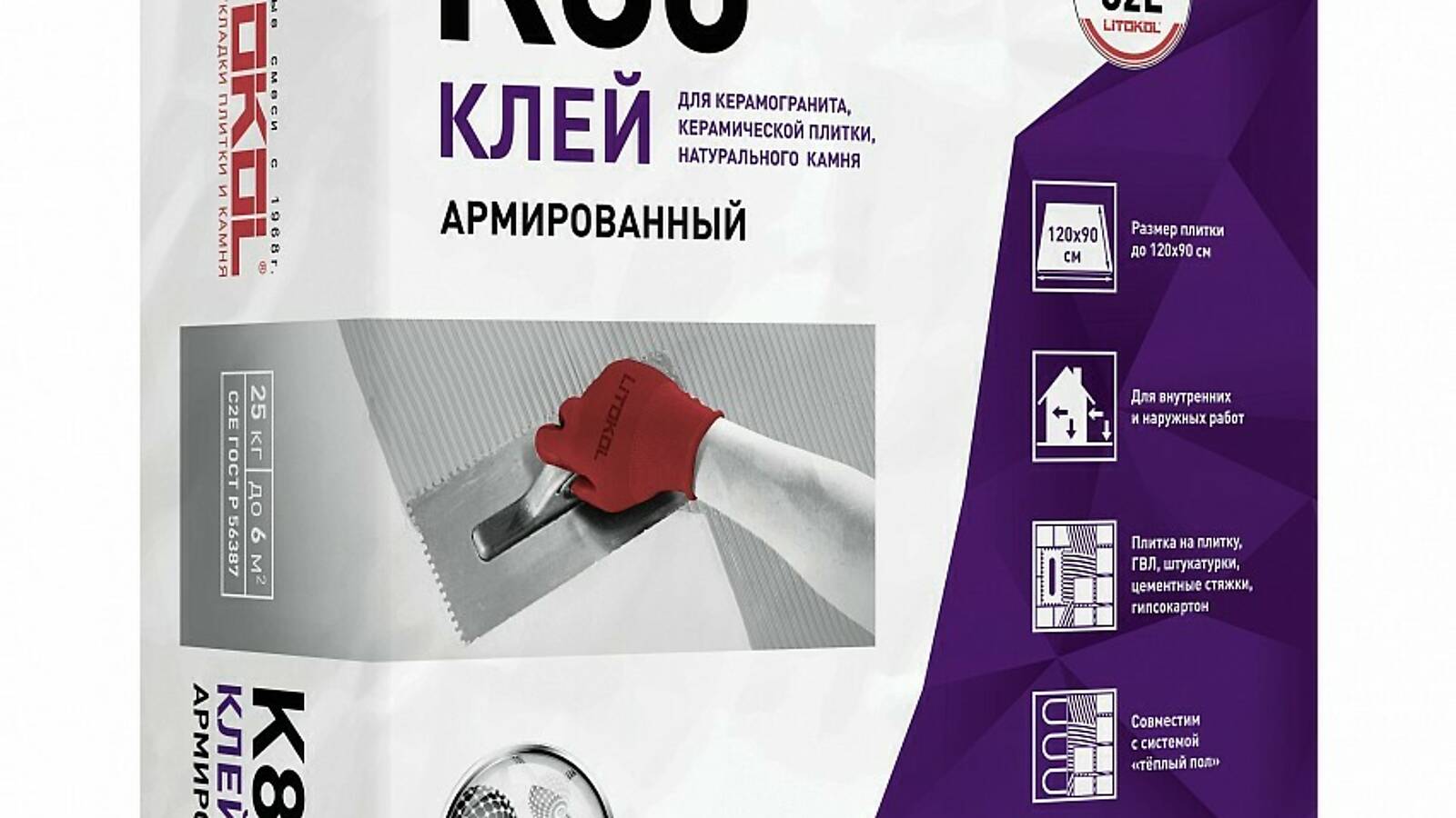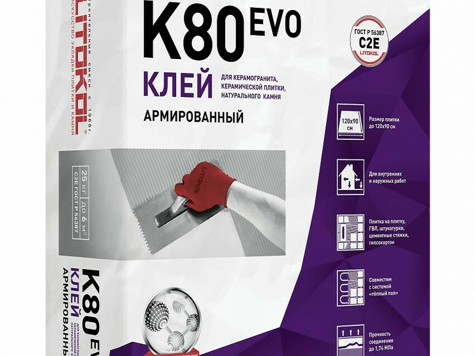 LITOFLEX K80 - универсальный клей с широким диапазоном применения: облицовка стен и полов, как при внутренних, так и при наружных работах, а также для облицовки балконов, террас, лестниц, фасадов. LITOFLEX K80 предназначен для укладки керамогранита, керамической плитки, клинкера, натурального камня с устойчивой структурой как на стабильные основания, так и на основания подверженные деформации, в том числе и методом укладки «плитка на плитку».