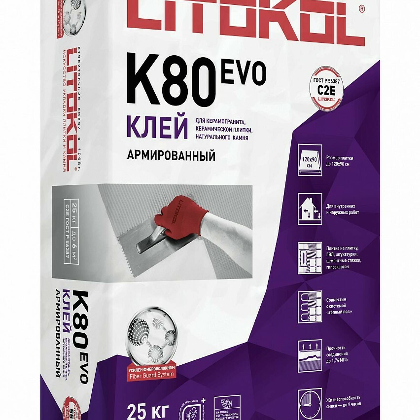 LITOFLEX K80 - цементный клей (С) с улучшенными техническими характеристиками (2) с увеличенным временем открытого слоя (Е), относится к классу C2E согласно классификации Европейских Норм EN 12004.