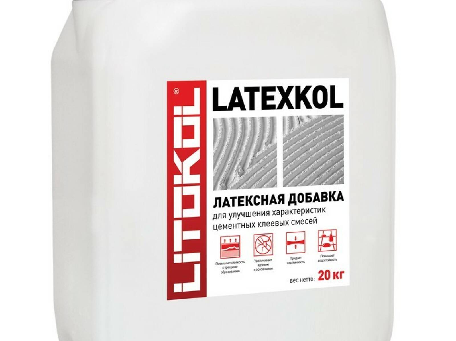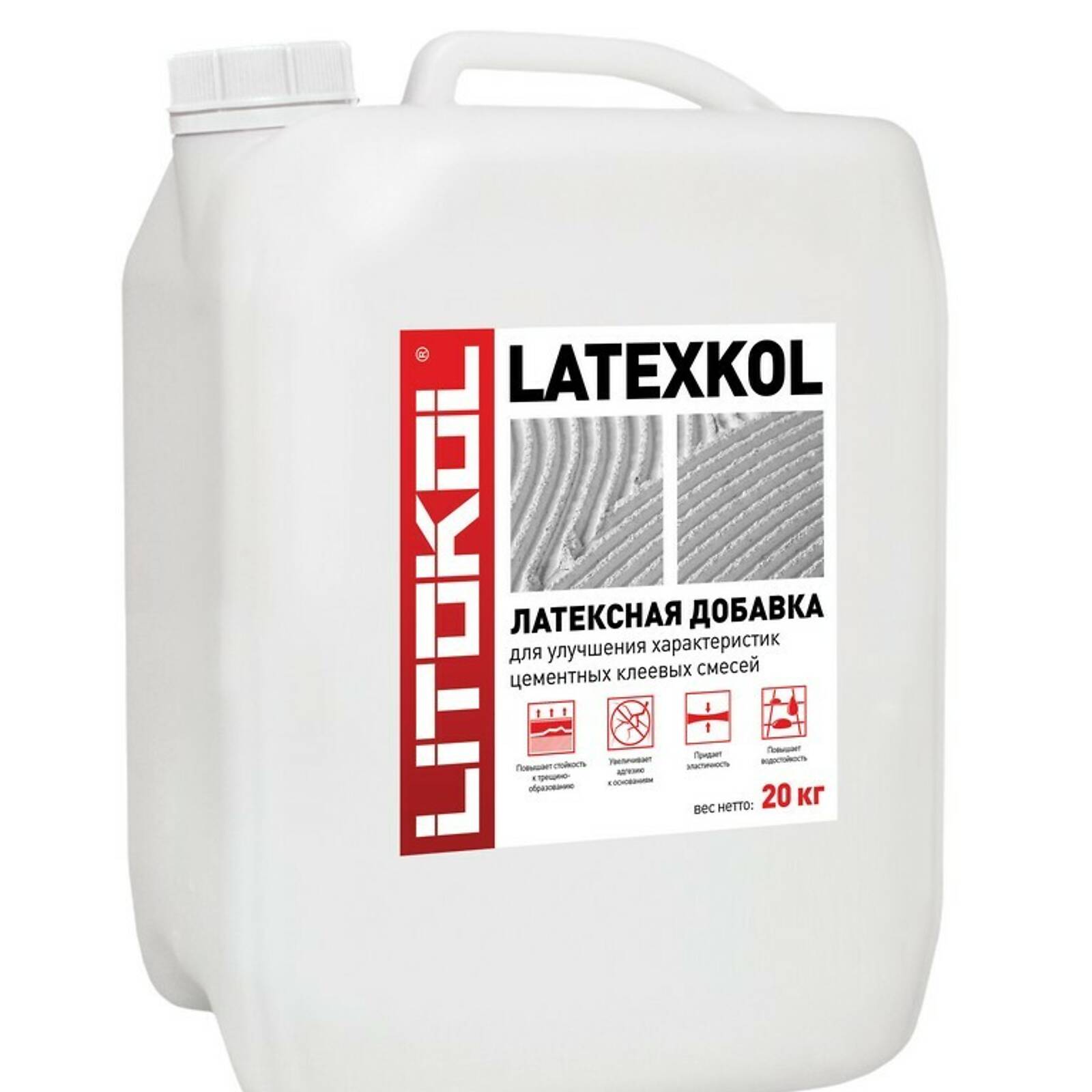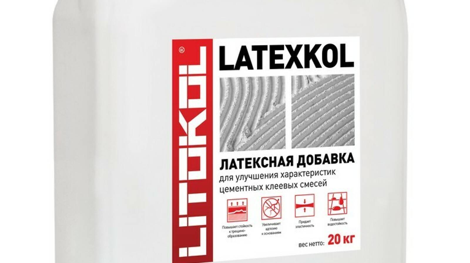 Латексная добавка LATEXKOL-м, предназначена для придания эластичности цементным клеевым смесям, повышения их стойкости к трещинообразованию при деформациях и повышения адгезии к основаниям.