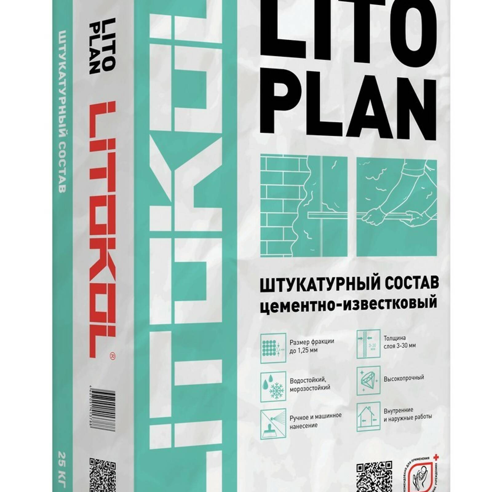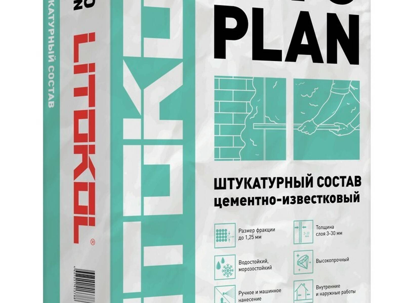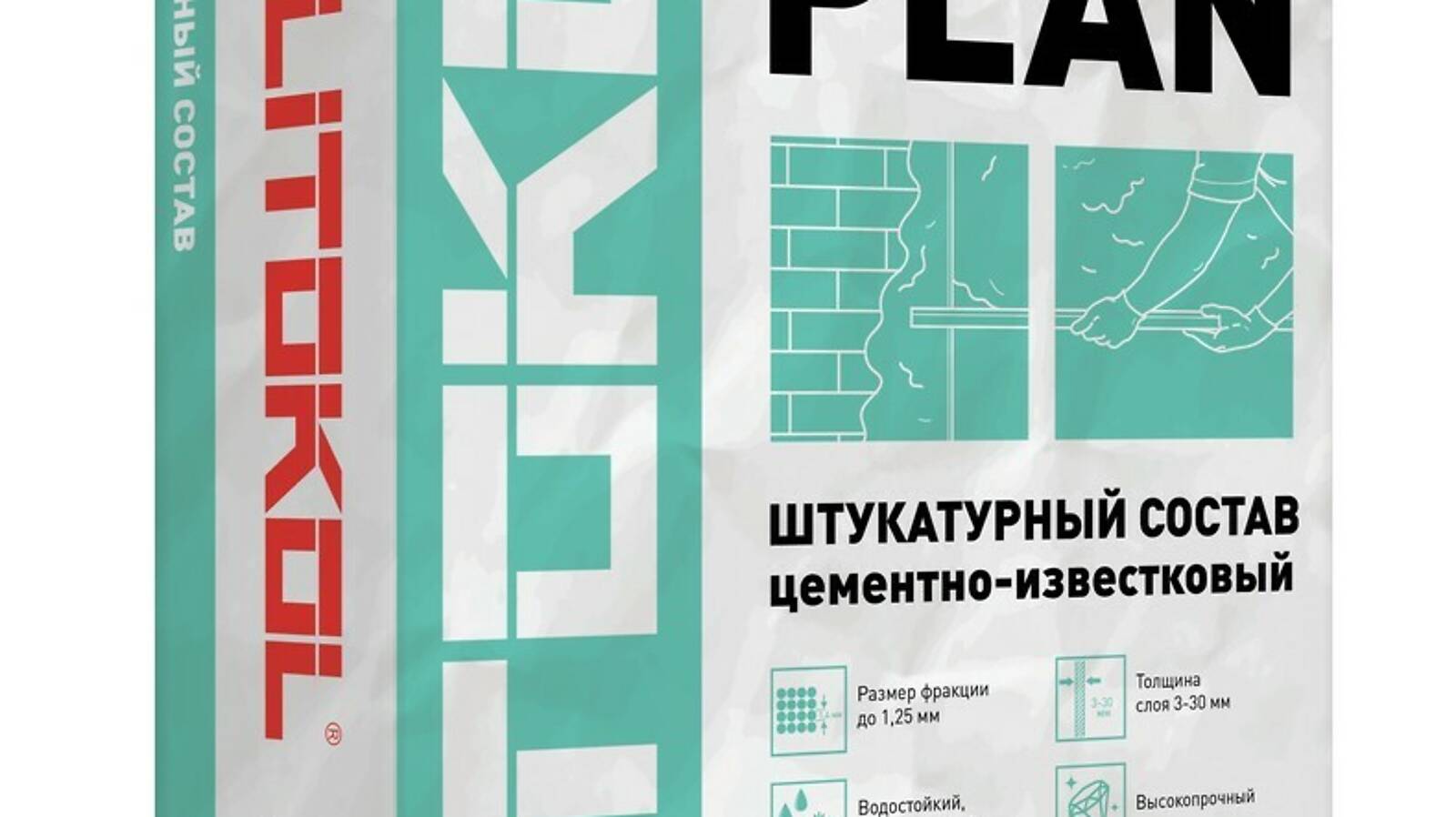 LITOPLAN — цементный штукатурный состав стандартного схватывания и высыхания, на основе гидравлических вяжущих, инертных наполнителей и специальных органических добавок.