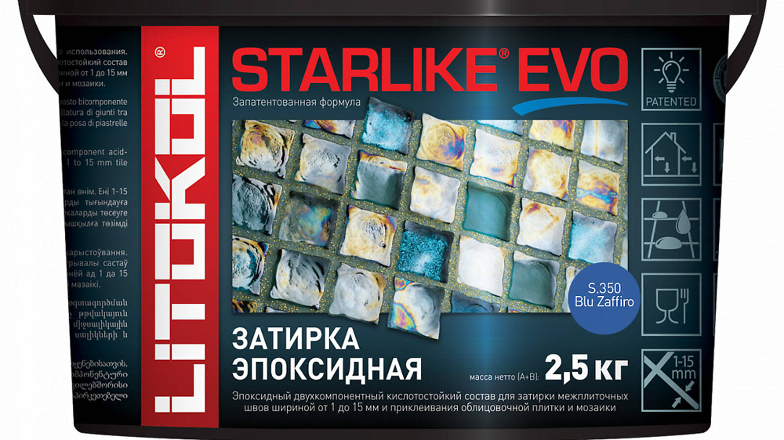 STARLIKE EVO двухкомпонентныи эпоксидныи кислотостоикии, щелочестоикии состав для затирки межплиточных швов с ширинои шва от 1 до 15 мм и использования в качестве клея для всех видов облицовочнои плитки и мозаики.