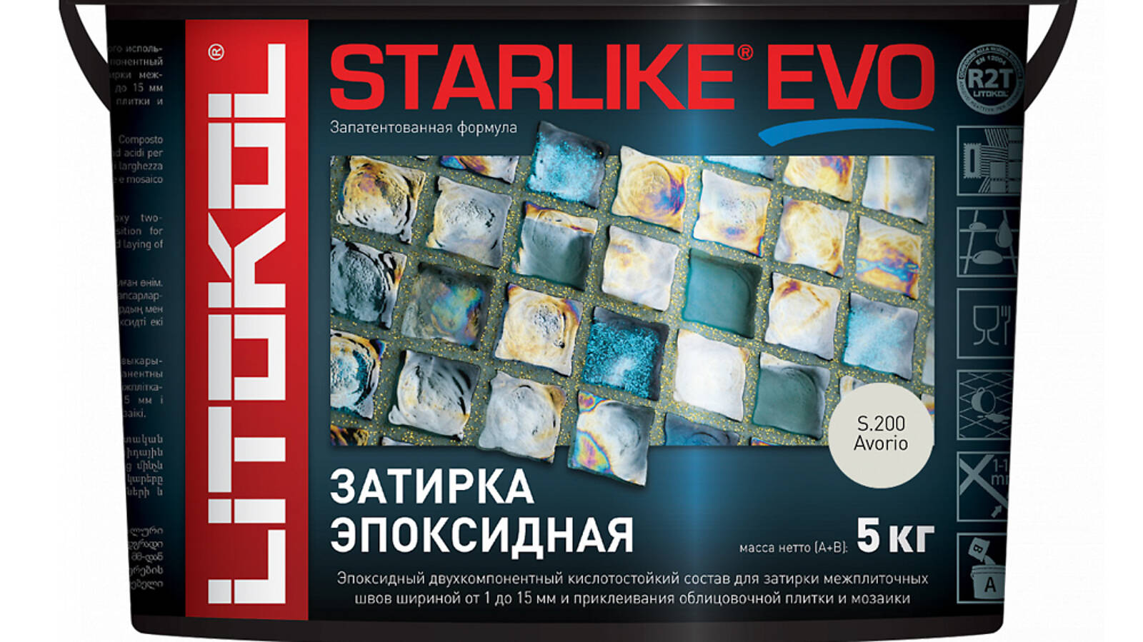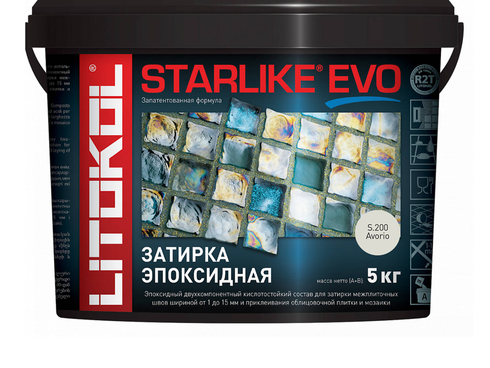 STARLIKE EVO двухкомпонентныи эпоксидныи кислотостоикии, щелочестоикии состав для затирки межплиточных швов с ширинои шва от 1 до 15 мм и использования в качестве клея для всех видов облицовочнои плитки и мозаики.