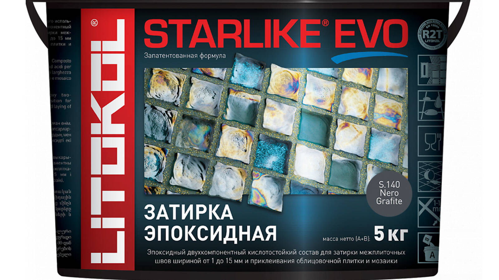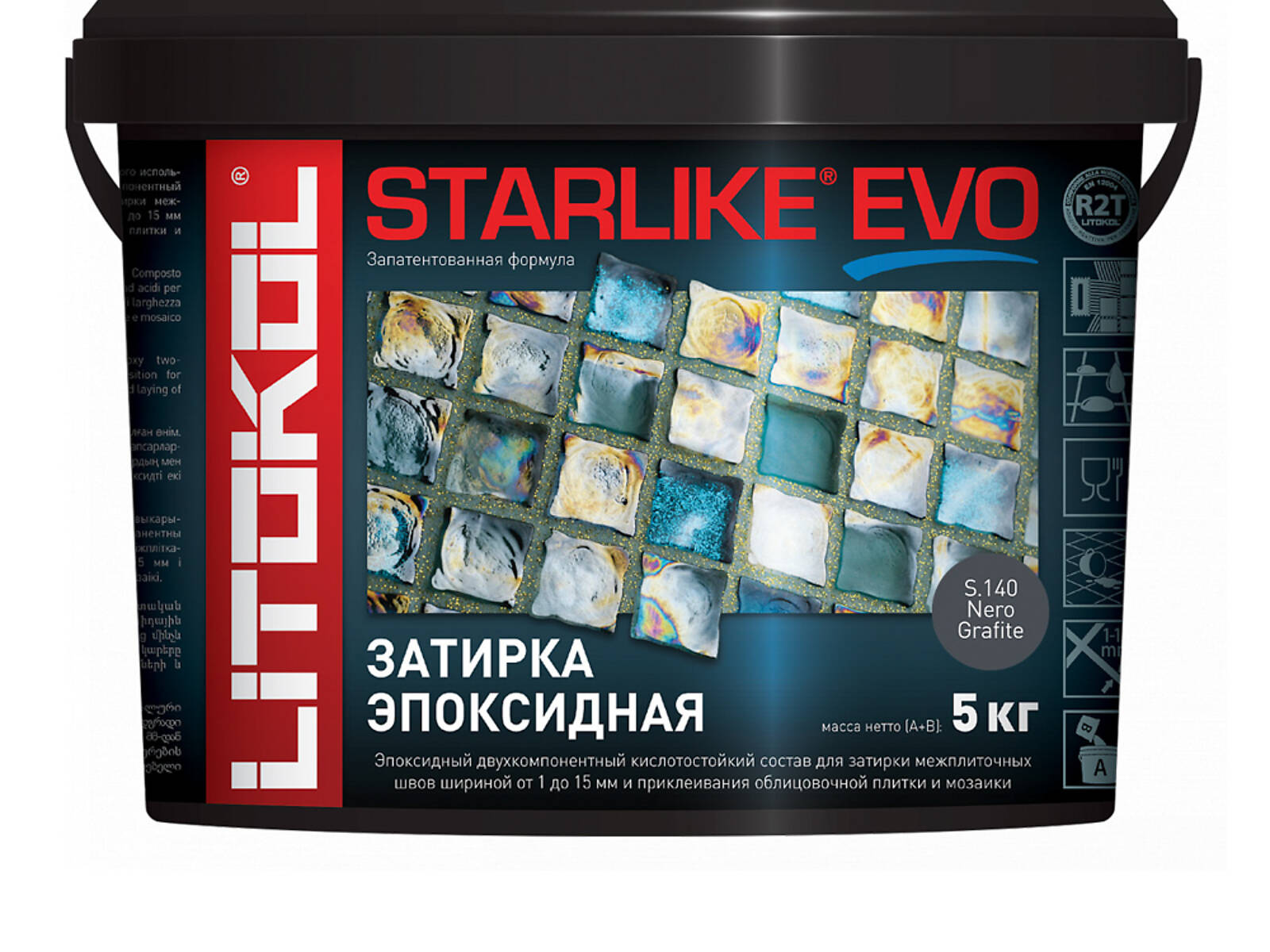 STARLIKE EVO двухкомпонентныи эпоксидныи кислотостоикии, щелочестоикии состав для затирки межплиточных швов с ширинои шва от 1 до 15 мм и использования в качестве клея для всех видов облицовочнои плитки и мозаики.