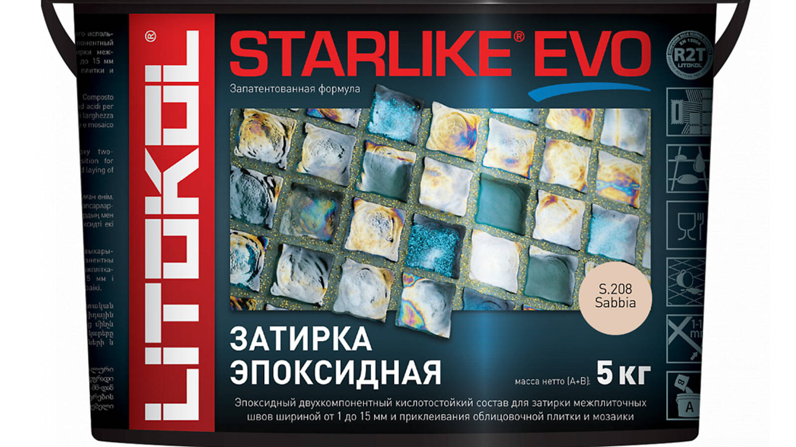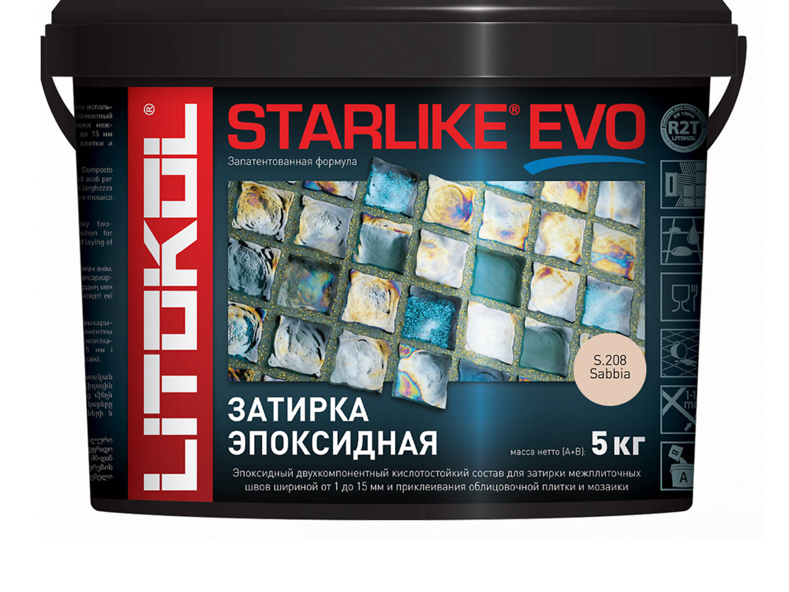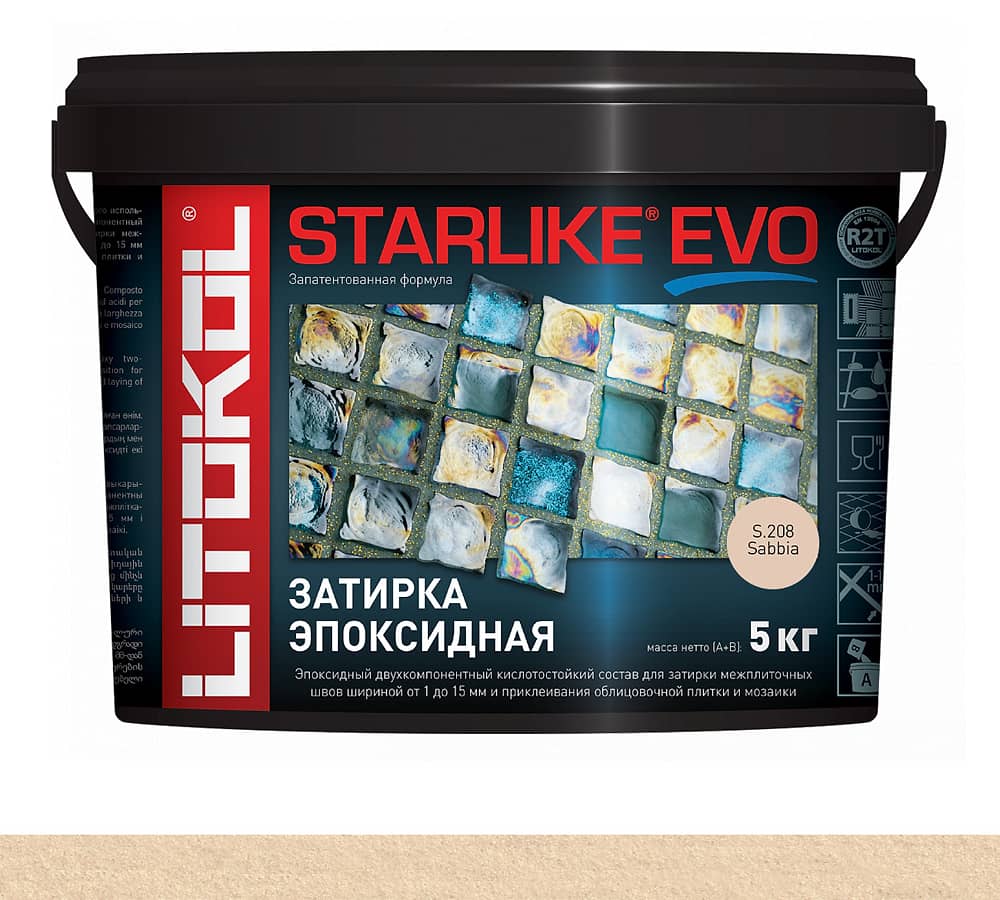 STARLIKE EVO двухкомпонентныи эпоксидныи кислотостоикии, щелочестоикии состав для затирки межплиточных швов с ширинои шва от 1 до 15 мм и использования в качестве клея для всех видов облицовочнои плитки и мозаики.