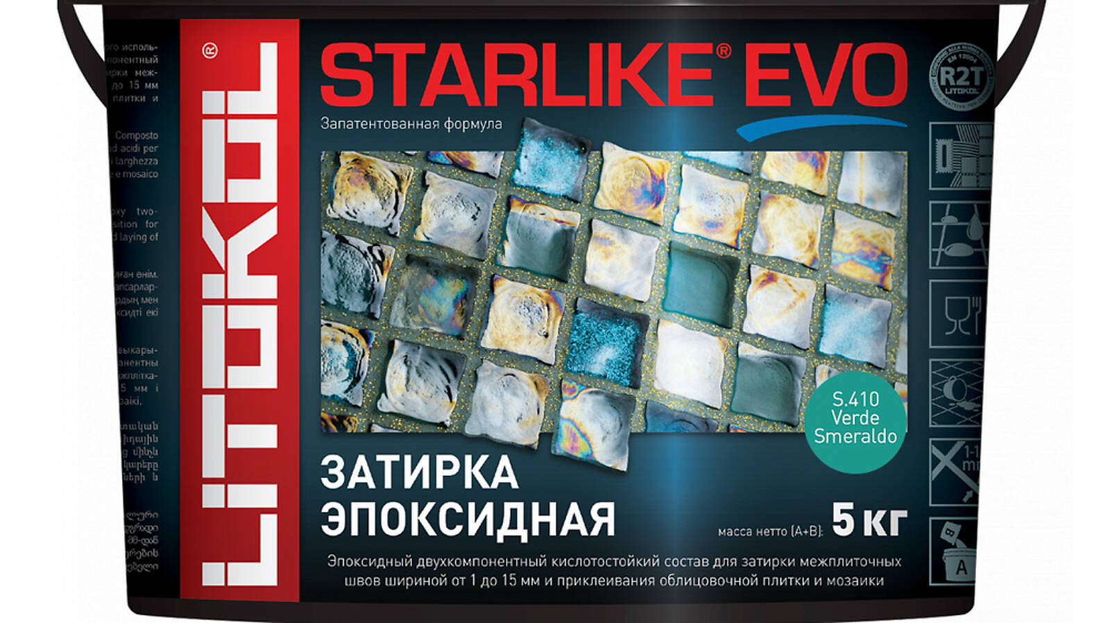 STARLIKE EVO двухкомпонентныи эпоксидныи кислотостоикии, щелочестоикии состав для затирки межплиточных швов с ширинои шва от 1 до 15 мм и использования в качестве клея для всех видов облицовочнои плитки и мозаики.