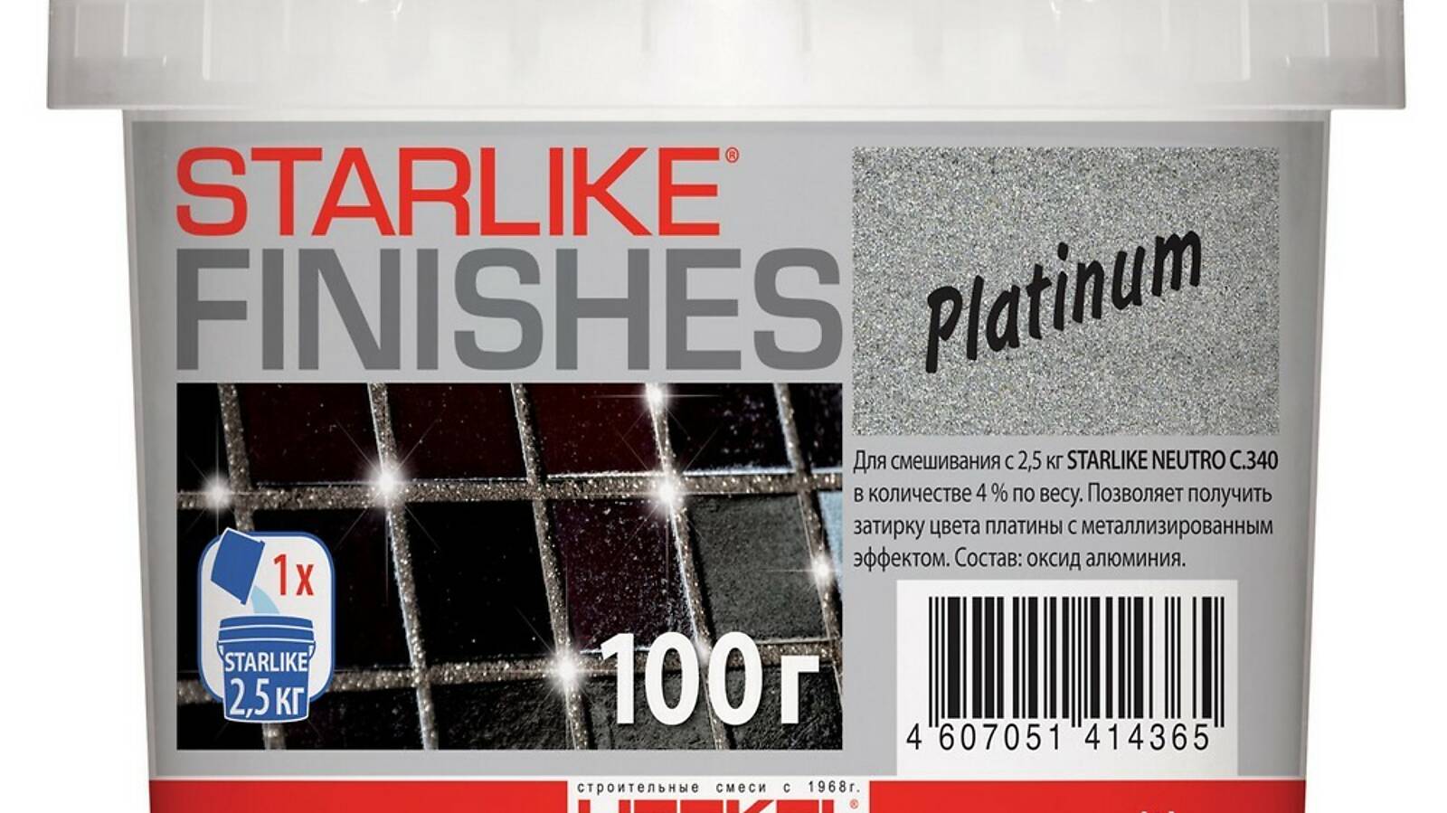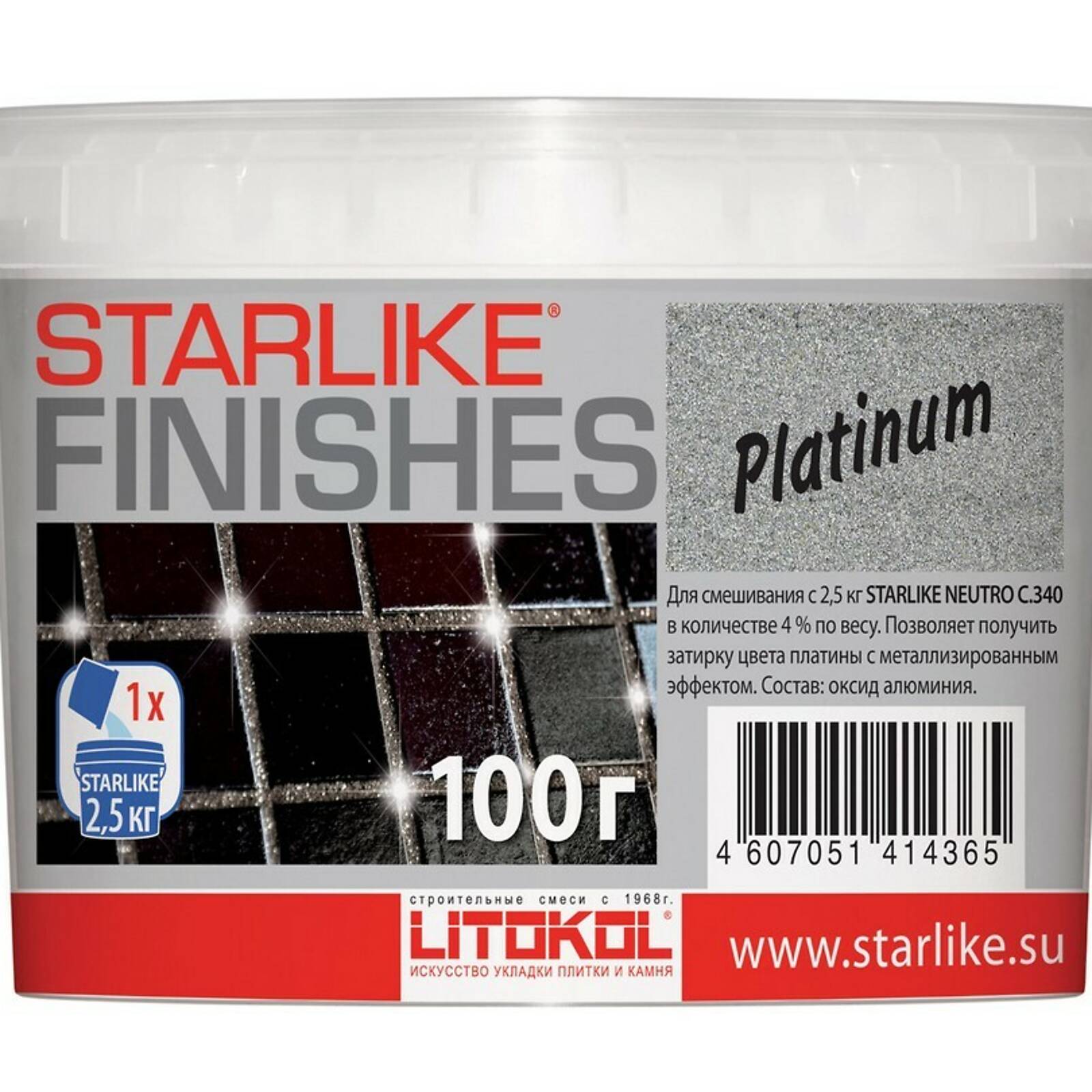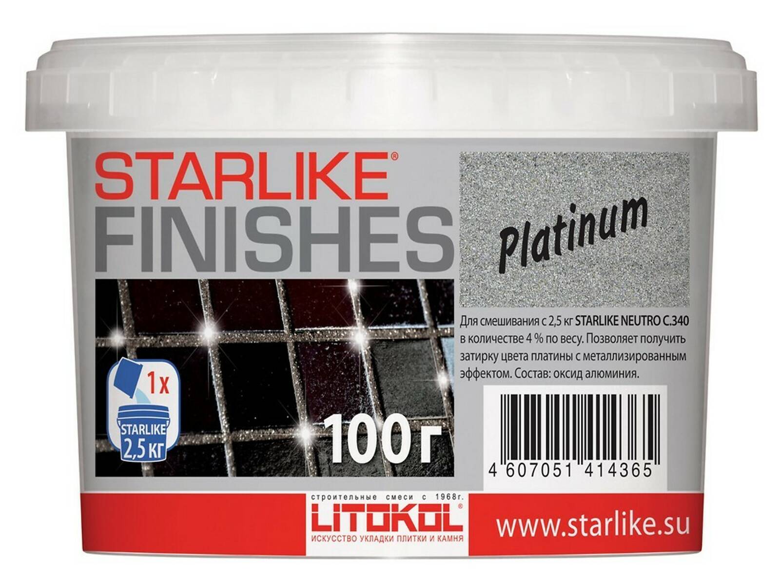 STARLIKE FINISHES Platinum — декоративная добавка в виде порошка серебристого цвета. Предназначена для смешивания с Starlike NEUTRO для получения изысканной поверхности межплиточных швов цвета серебра.