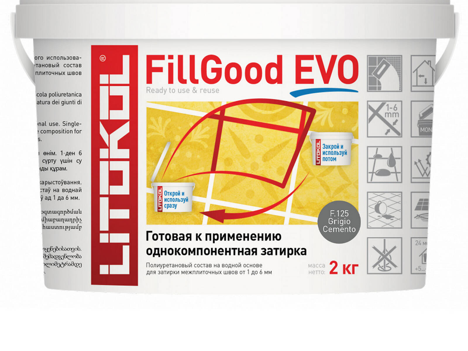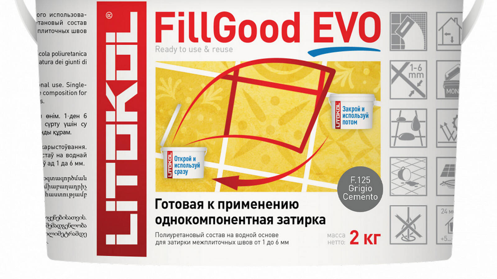 FillGood EVO однокомпонентный продукт на водной основе, отверждение которого происходит за счёт потери воды, содержащейся в составе. В отличие от двухкомпонентных реактивных эпоксидных продуктов, FillGood EVO позволяет избежать потери материала, дает больше времени для производства работ по затирке швов, идеально подходит для крупноформатной облицовки, где материал наносится только по периметру плитки.