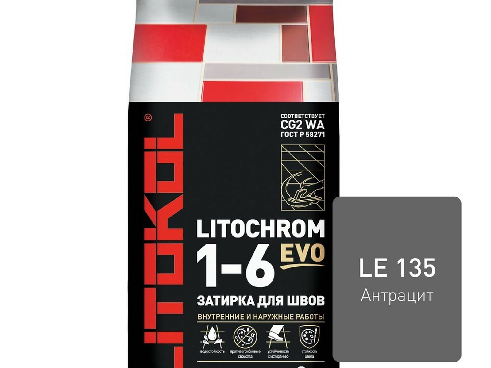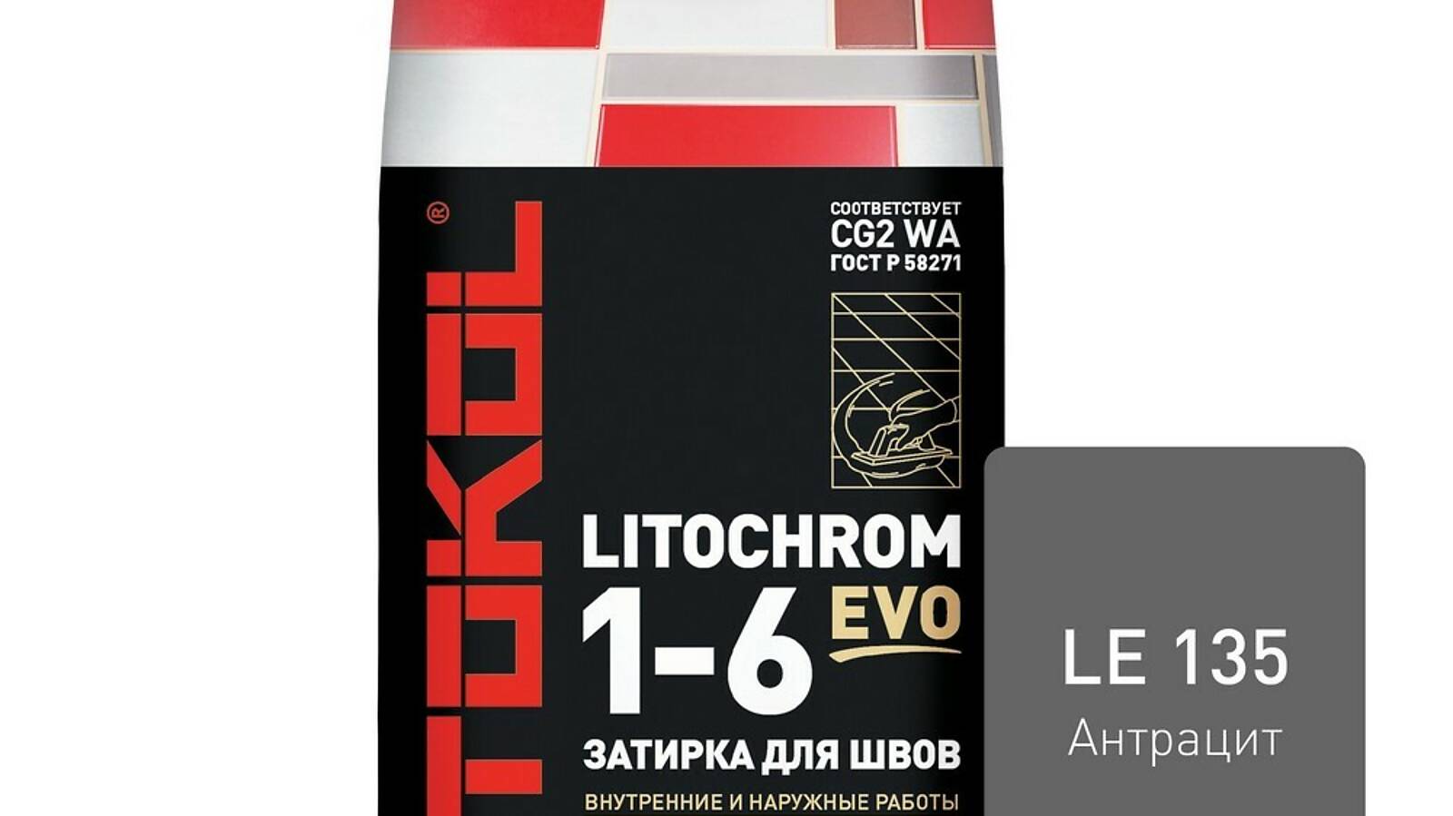 LITOCHROM 1-6 EVO - цветная цементная затирка для заполнения межплиточных швов шириной от 1 до 6 мм с противогрибковыми свойствами. Подходит для внутренних и наружных работ.