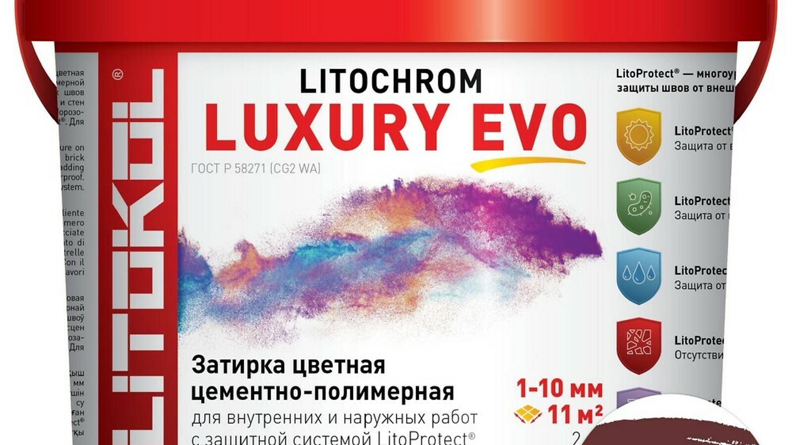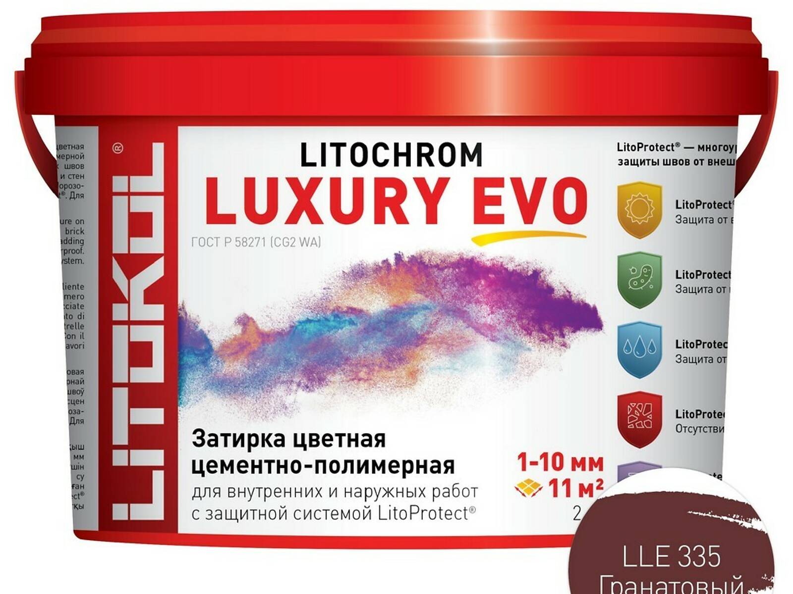 LitoProtect® AQUA — защита от воды и загрязнений. Поверхность швов обладает ярко выраженными водоотталкивающими свойствами, «эффект капли» проявляется при контакте поверхности швов с водой. Швы защищены от увлажнения, вымывания, и образования высолов, что позволяет использовать LITOCHROM LUXURY EVO при облицовке ванных, душевых, бассейнов, террас, балконов и т. д.