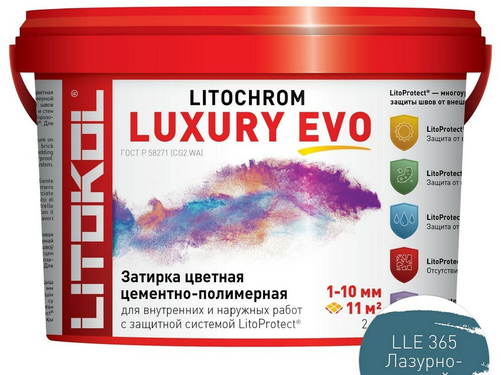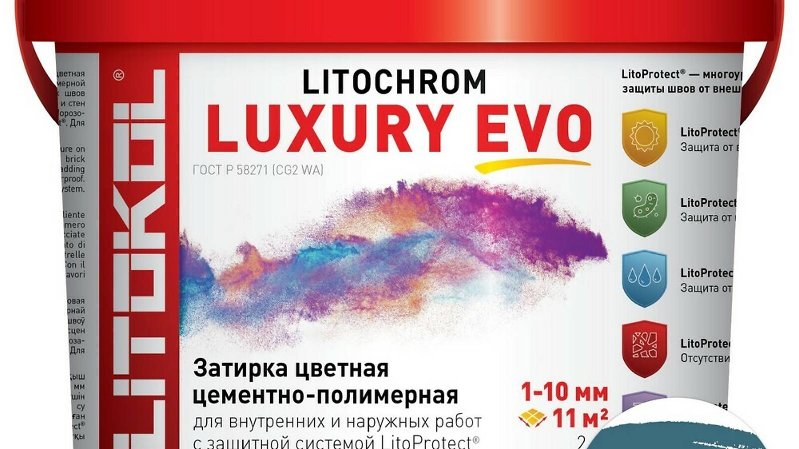 LitoProtect® AQUA — защита от воды и загрязнений. Поверхность швов обладает ярко выраженными водоотталкивающими свойствами, «эффект капли» проявляется при контакте поверхности швов с водой. Швы защищены от увлажнения, вымывания, и образования высолов, что позволяет использовать LITOCHROM LUXURY EVO при облицовке ванных, душевых, бассейнов, террас, балконов и т. д.