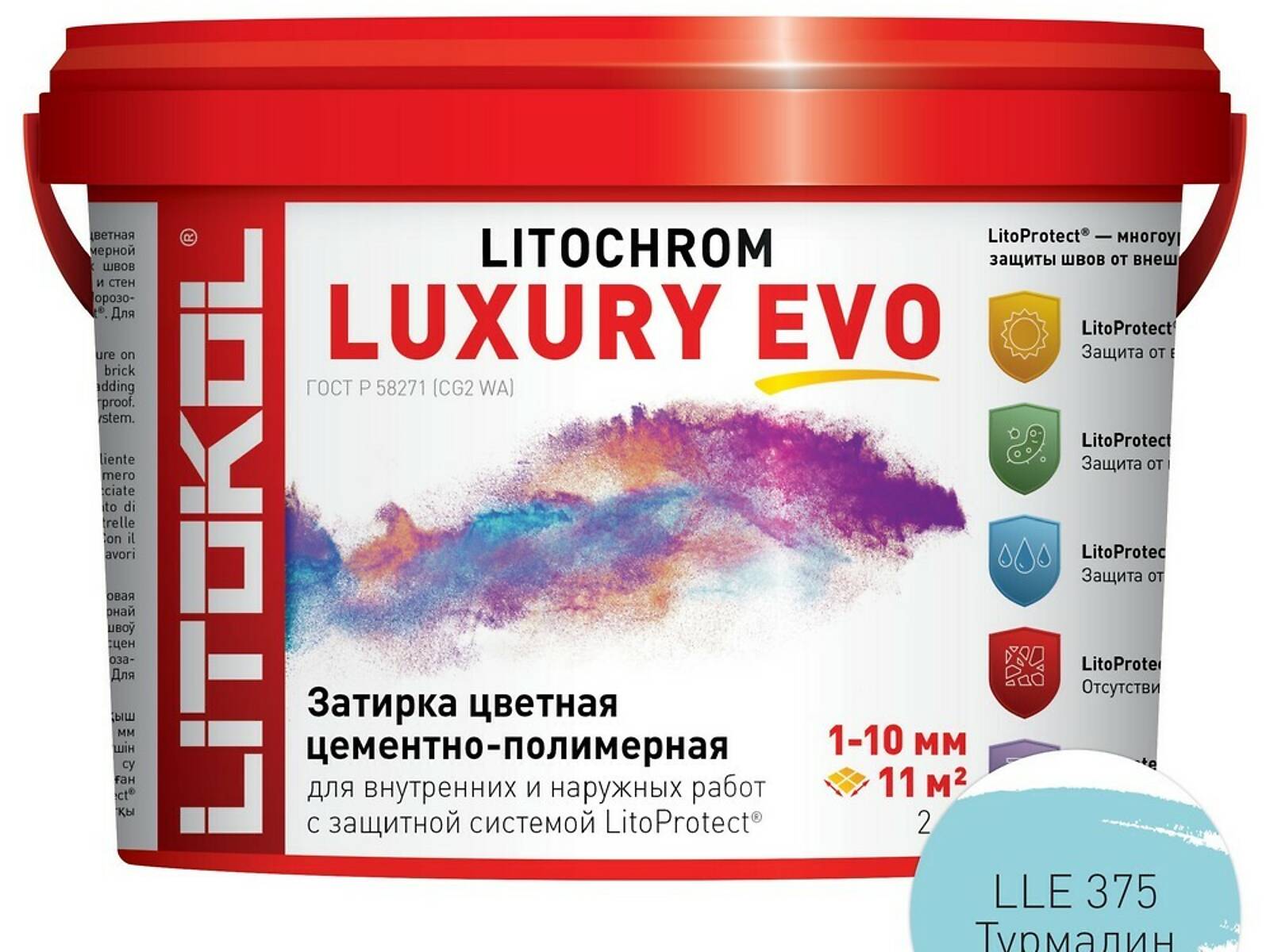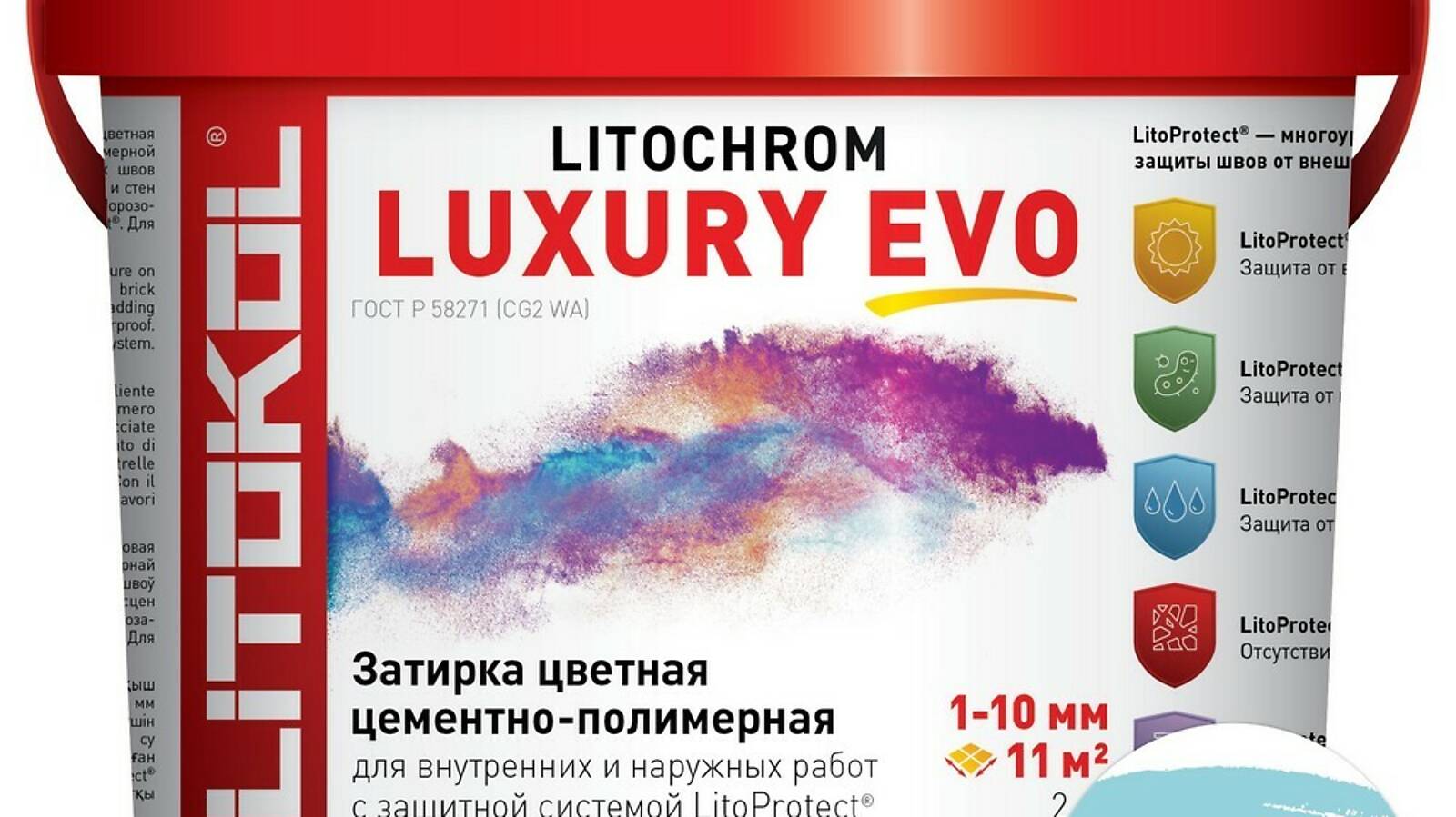 LitoProtect® AQUA — защита от воды и загрязнений. Поверхность швов обладает ярко выраженными водоотталкивающими свойствами, «эффект капли» проявляется при контакте поверхности швов с водой. Швы защищены от увлажнения, вымывания, и образования высолов, что позволяет использовать LITOCHROM LUXURY EVO при облицовке ванных, душевых, бассейнов, террас, балконов и т. д.
