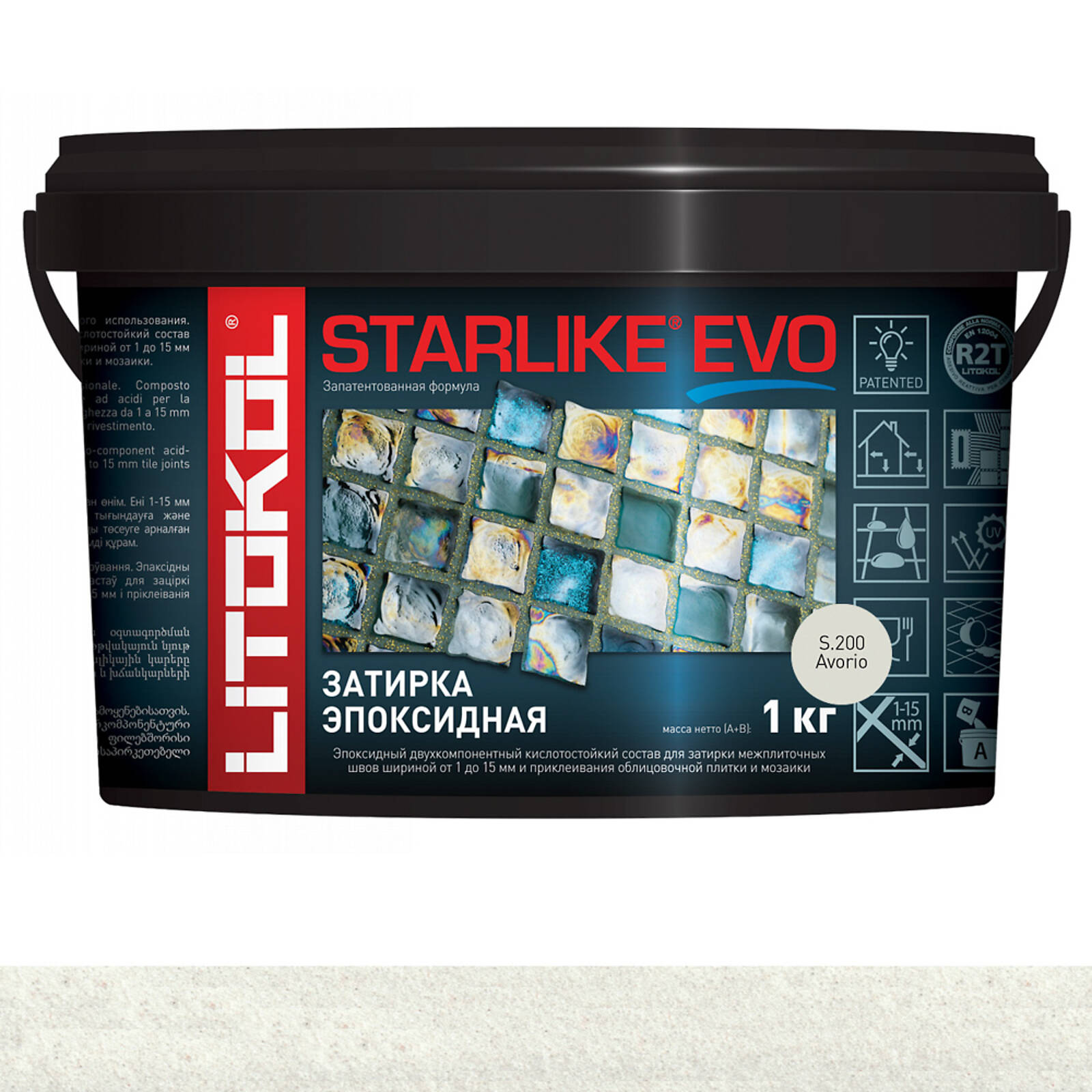 STARLIKE EVO двухкомпонентныи эпоксидныи кислотостоикии, щелочестоикии состав для затирки межплиточных швов с ширинои шва от 1 до 15 мм и использования в качестве клея для всех видов облицовочнои плитки и мозаики.